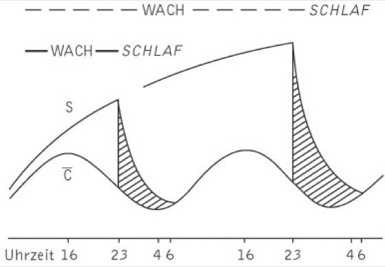 Wie spektralanalytische Untersuchungen des Schlaf-EEGs gezeigt haben, kommt es nach Schlafentzug zu einer Zunahme der langsamwelligen Delta-Aktivität. Dieser "Rebound" an Delta-Aktivität bzw. Tiefschlaf läßt sich durch Frequenzanalysen besser darstellen als durch die übliche visuelle Schlafstadien-Klassifikation. Nach Borbély besteht zwischen Delta-Wellen-Aktivität und vorhergegangener Wachzeit ein linearer Zusammenhang; d.h. je länger die dem Schlaf vorausgehende Wachzeit ist, desto mehr Delta-Wellen treten auf. Die Delta-Wellen im Schlaf werden jedoch nicht linear über den ganzen Verlauf der Nacht produziert, sondern nehmen exponentiell mit der Schlafdauer ab. Borbély schlug vor, diesen von der Wachzeit abhängigen homöostatischen Prozeß als S (Schlaf) zu bezeichnen. Der zweite wichtige Prozeß in diesem Modell ist Prozeß C. Die Einführung dieses Prozesses trägt der Tatsache Rechnung, daß Schlafen und Wachen in eine Vielzahl anderer biologischer Rhythmen eingebettet sind. Prozeß C verläuft parallel zur Körpertemperatur. Die Interaktion zwischen den Prozessen C und S bestimmt das Schlaf-Wach-Verhalten. Je größer die Schere zwischen den beiden Kurven, desto höher die Schlafbereitschaft. Laufen die beiden Kurven zusammen, d.h. wurde Prozeß S im Schlaf abgebaut und steigt C an, kommt es zum Erwachen. Prozeß S steigt bei Schlafentzug stärker an. Der exponentielle Anfall von S im Schlaf bewirkt jedoch, daß die Schlafzeit nach Schlafentzug nicht linear zunimmt.