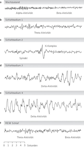 Abb. Schlafstadien. Die fünf Schlafstadien, wie sie durch elektrophysiologische Daten vom Gehirn definiert sind.