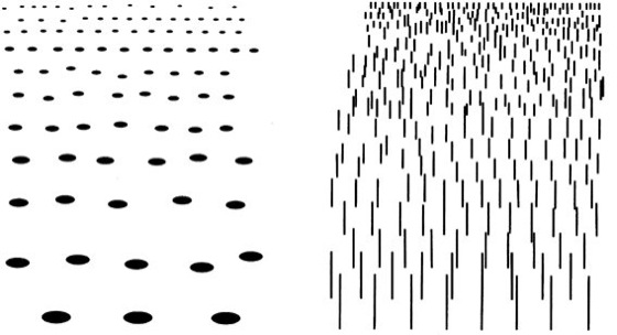 Texturgradient, wichtiger Hinweisreiz für das visuelle System, der Schlußfolgerungen auf Entfernungen zuläßt. Die wahrgenommenen Elemente scheinen mit steigender Entfernung zum Betrachter dichter gepackt zu sein ( Abb. ). Obwohl es sich bei der Darstellung um eine ebene Fläche handelt, führt die Veränderung in der Textur zum Eindruck von Tiefe (Tiefenwahrnehmung).