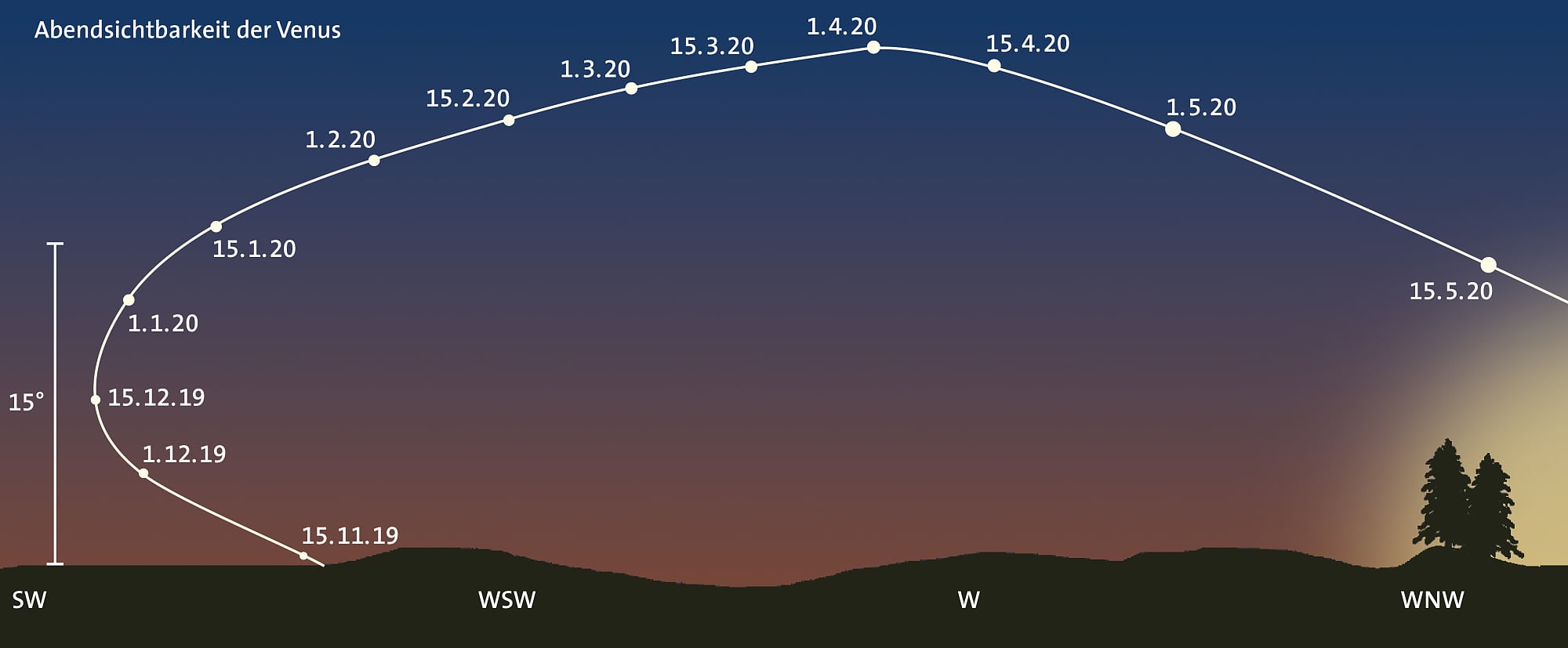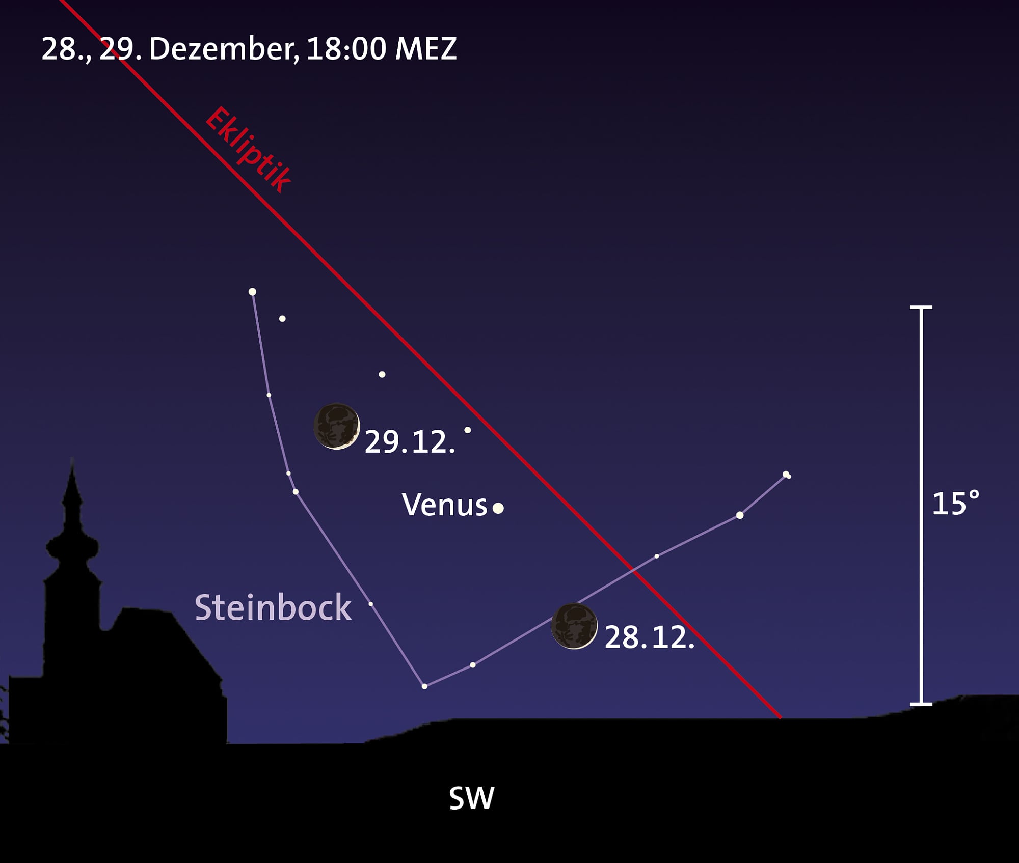 Venus entwickelt sich im Dezember zum »Abendstern«: Wenn gegen 17:00 Uhr die bürgerliche Dämmerung endet, finden wir unsere Nachbarin im Sonnensystem am 1. Dezember etwa 6, am Monatsende bereits rund 15 Grad über dem Südwesthorizont. Sie ist nach dem Mond das hellste Objekt des Nachthimmels: Ihre scheinbare Helligkeit überschreitet am 23. Dezember die Marke von –4,0 mag. Noch bis in den Mai 2020 hinein wird sie am Abendhimmel leuchten, wobei sie ihren größten Glanz (–4,7 mag) Ende April des kommenden Jahres erreichen wird (siehe Grafik oben). Das Venusscheibchen im Teleskop wächst im Dezember leicht von 11,6 auf 13,0 Bogensekunden, der Beleuchtungsgrad sinkt von 89 auf 82 Prozent. Am 11. Dezember kommt die Venus dem Saturn auf etwa 1,9 Grad nah und am Monatsende dem Mond (siehe Grafiken unten).
