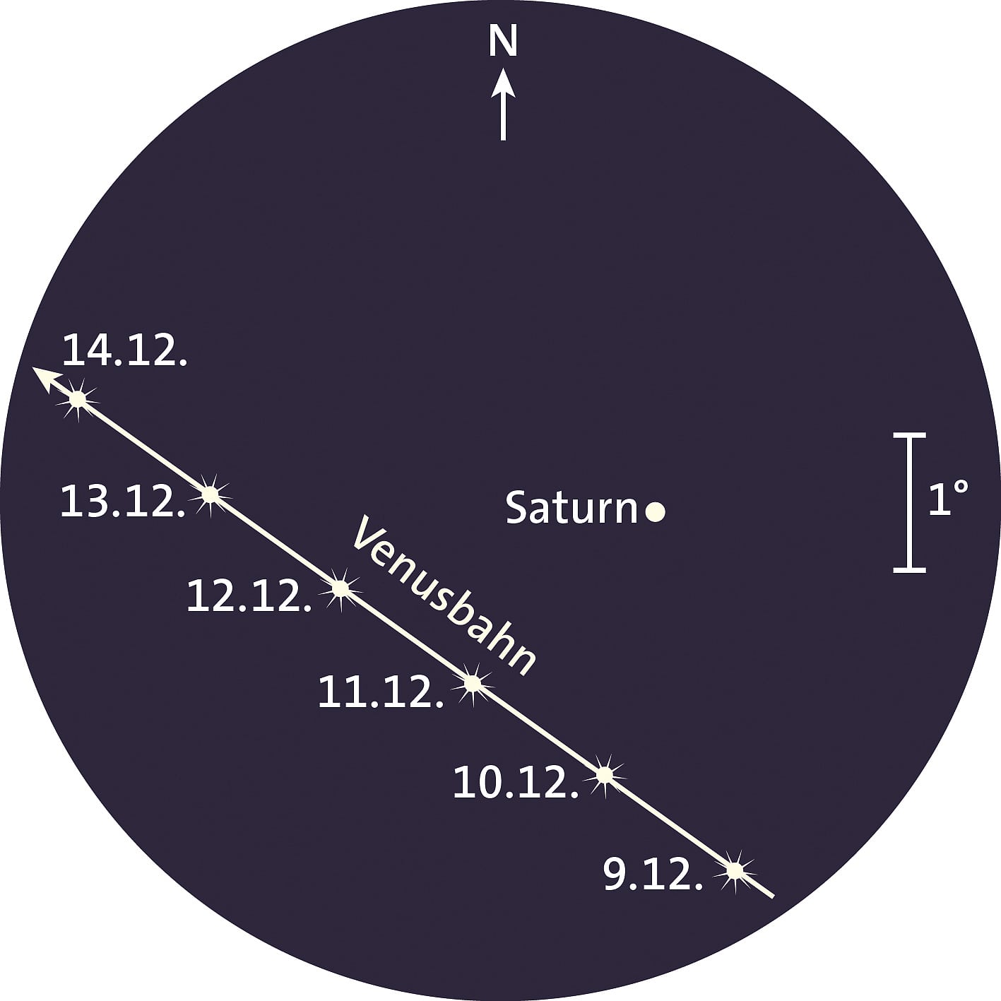 Saturn ist zu Monatsbeginn ab dem Ende der Abenddämmerung noch für etwa eine Stunde tief am Südwesthimmel zu sehen. Der 0,6 mag helle Planet geht am 1. Dezember um 19:05 Uhr, am 15. schon um 18:18 Uhr unter. Zum Monatsende entschwindet der Ringplanet in der Dämmerung. Am Abend des 11. Dezember kommt es zu einer sehenswerten Begegnung mit der hellen Venus.