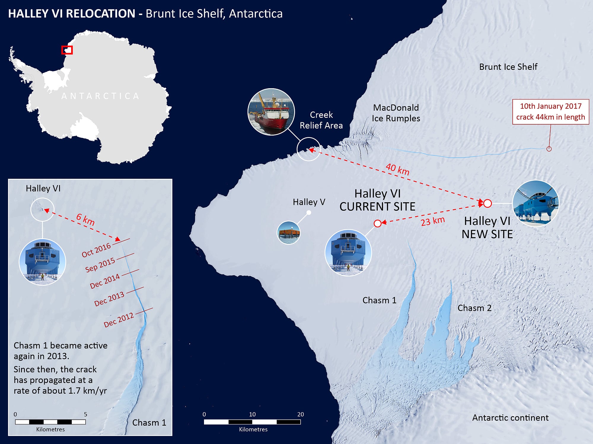 Im Jahr 2012 lieferten die Messwerte erste Anzeichen dafür, dass Chasm 1 wieder in Bewegung geraten war. Mit Radarmessungen haben BAS-Mitarbeiter diesen Befund dann überprüft. Kein Zweifel: Der Riss vergrößert sich. Mit einer Geschwindigkeit von 1,7 Kilometern pro Jahr wandert sein Ende immer weiter auf die landeinwärts von Halley gelegene Region zu. Die Spalte wird die Gebäude zwar nicht verschlingen. Doch sie könnte ein großes Stück vom Schelfeis abtrennen. Mitsamt der Station auf ihrem Rücken würde diese Scholle dann ins Weddellmeer davontreiben.