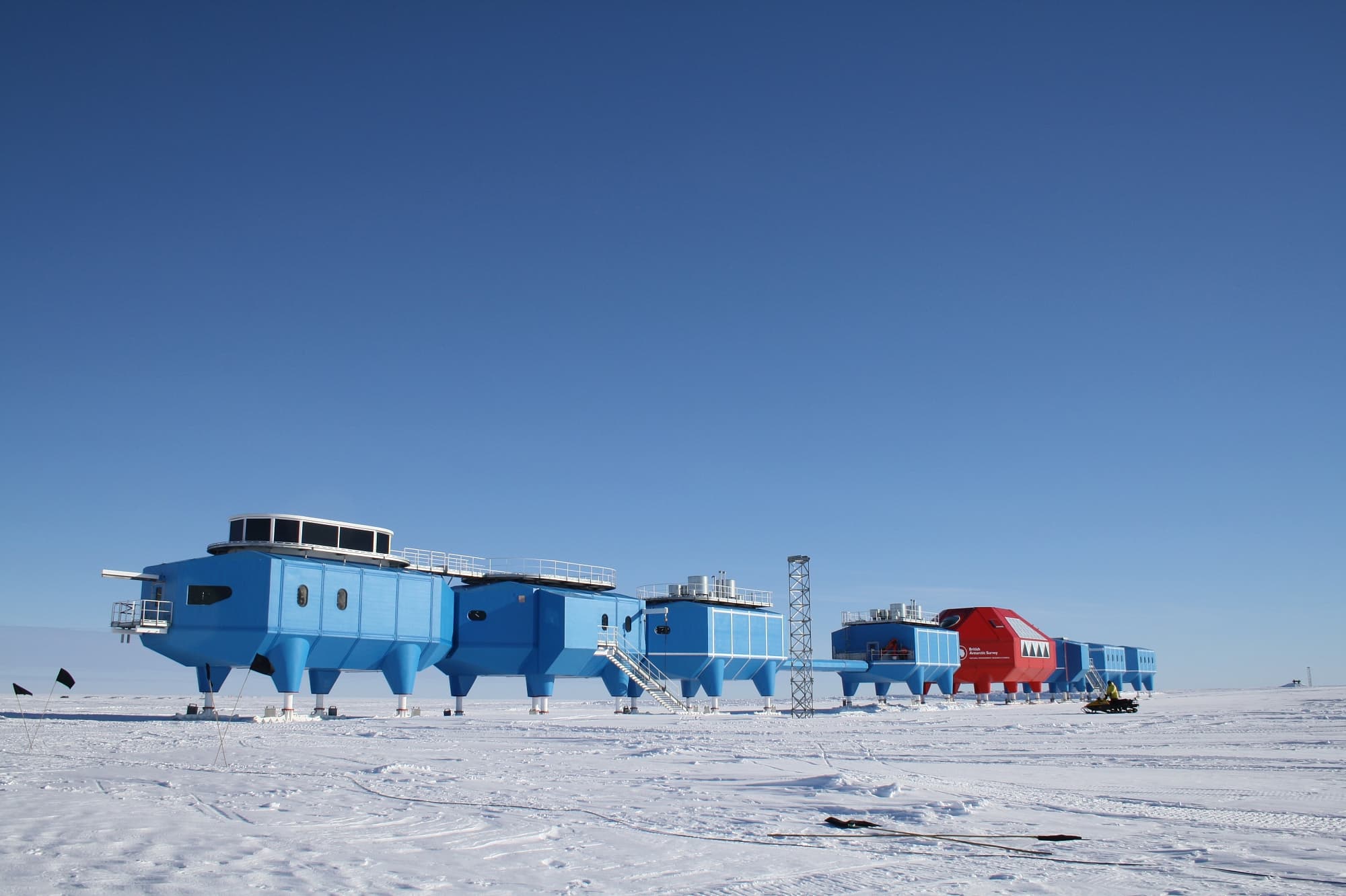 So besteht die Station aus acht einzelnen Modulen, die wie die Waggons eines Güterzuges aneinandergekoppelt sind. Bei Bedarf lassen sie sich voneinander trennen, so dass man jedes Teil einzeln an seinen neuen Bestimmungsort schaffen kann. Damit das möglichst reibungslos klappt, stehen die vier Beine jedes Segments auf Skiern. Man kann daher spezielle Kettenfahrzeuge vor das Modul spannen und es woanders hinschleppen. In ihrer neuen Position werden die einzelnen Teile dann zusammengekoppelt, bis die ganze Konstruktion wieder auf dem Eis steht wie eine große, blaue Raupe mit Wintersportambitionen.