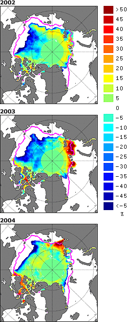 Meereis in der Arktis | Die Meereis-Ausdehnung in den Jahren 2002, 2003 und 2004: In Farbstufen dargestellt sind die Abweichungen vom Durchschnitt sowie in rosa die Begrenzung der Eisflächen als Median der Septemberwerte von 1979 bis 2000. Auffällig ist ein Eismangel vor der Ostküste Grönlands, der im 2002 erstmals auftrat.