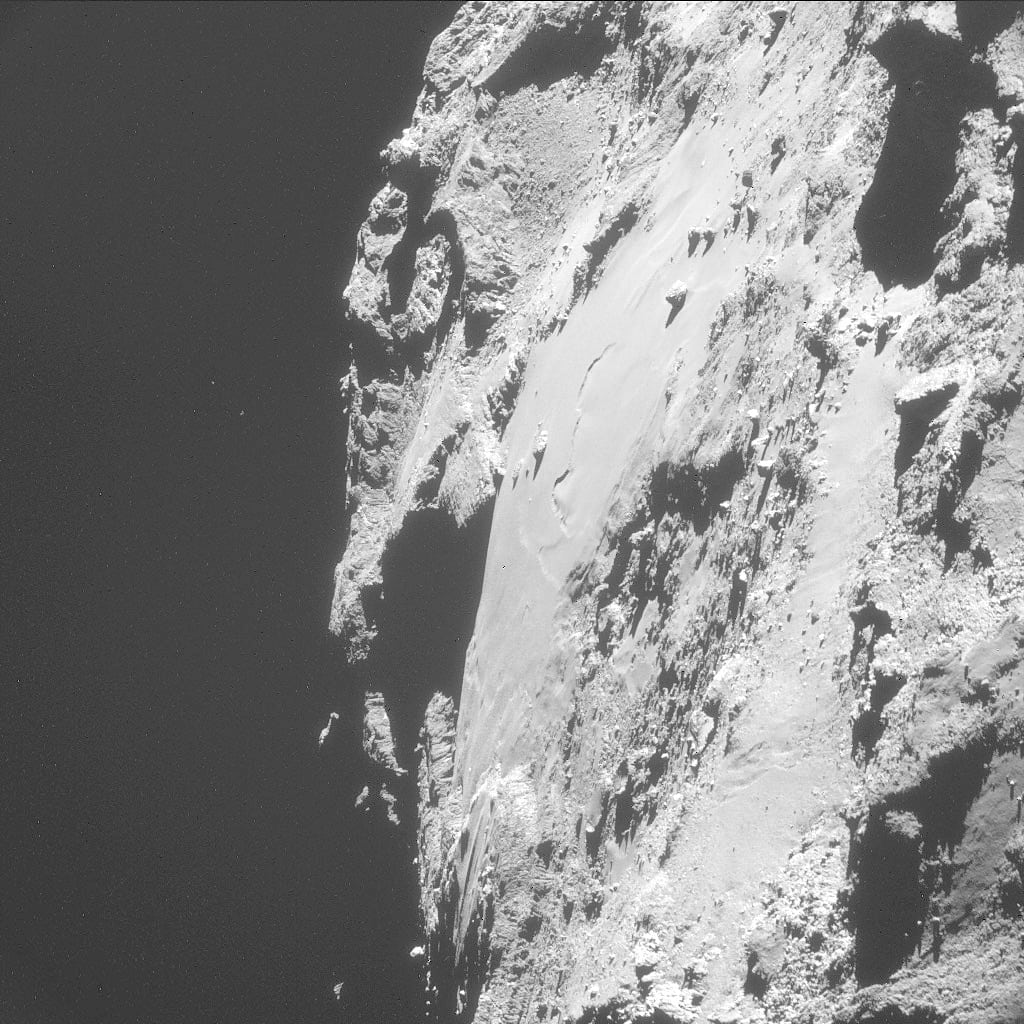 Sehr zerklüftet zeigt sich 67P auf der nachfolgenden Aufnahme. Scharfkantige Gebirge durchbrechen sanfte Ebenen, die mit Staub bedeckt sind, der etwa so dunkel wie der Toner in einem Laserdrucker ist. Zum linken Bildrand hin ist das Material des Kerns deutlicher zu erkennen, es besteht offenbar aus einer Vielzahl kleinerer Brocken, die miteinander verbacken sind. Sie könnten die Materie sein, aus dem sich der Kometenkern vor rund 4,5 Milliarden Jahren im solaren Urnebel zusammenballte.