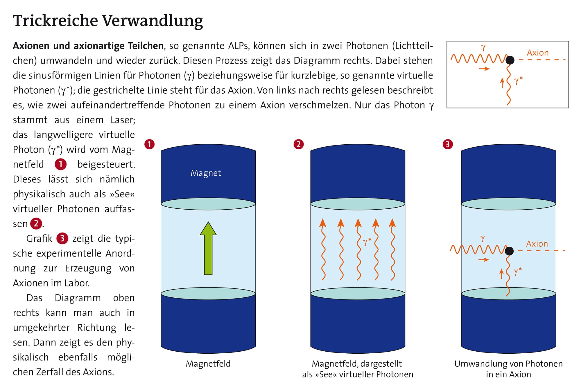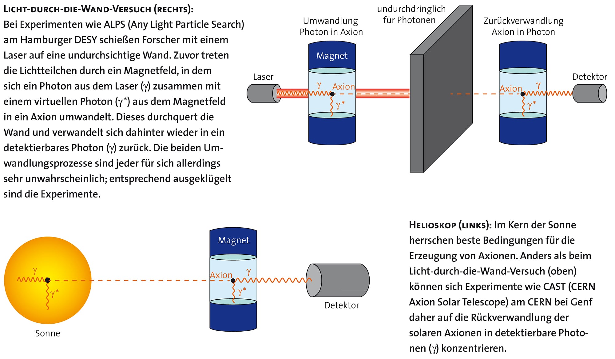 In Deutschland arbeiten Forscher noch an drei weiteren Konzepten für Axionen-Detektoren. Eine der Techniken, bei der sich starkes Laserlicht beim Gang durch ein Magnetfeld in Axionen umwandeln soll, wird am Desy in Hamburg unter den Namen ALPS seit zehn Jahren erprobt. Eine stark vergrößerte und verbesserte Version namens ALPS-II könnte 2019 mit den Messungen beginnen, sagt Andreas Ringwald.