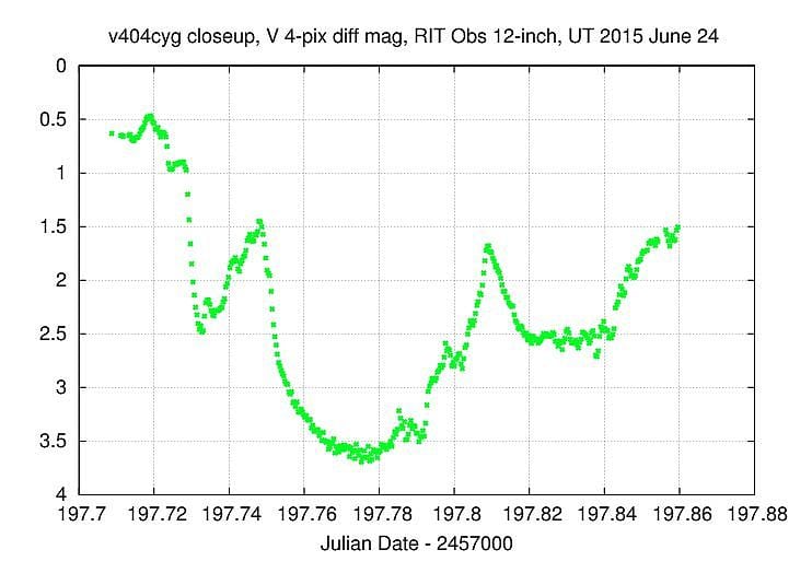 "Der Stern spielte völlig verrückt", erzählt Michael Richmond vom Rochester Institute of Technology im US-Bundesstaat New York. Richmond beobachtete V404 Cygni in der Nacht vom 23. auf den 24. Juni mit seinem Zwölf-Zoll-Schmidt-Cassegrain-Teleskop bei f/10 und einer SBIG-ST-9E-CCD-Kamera mit V-Band-Filter. "Innerhalb von eineinhalb Stunden fiel seine Helligkeit um 3,5 Magnituden, um in der folgenden Stunde wieder um zwei Größenklassen zuzulegen." Seine Einzelbilder fügte er zu einer eindruckvollen Animation zusammen. Von der American Association of Variable Star Observers (AAVSO) alarmiert, verfolgten Amateurastronomen zwischen dem 18. und 27. Juni ähnliche Helligkeitsschwankungen, visuelle Beobachter nahmen sogar ein Flackern im Zeitraum von Sekunden wahr – kürzer als die typischen Belichtungszeiten der CCD-Fotografen. Ob es sich dabei um echte Helligkeitsfluktuationen der Quelle gehandelt hat oder atmosphärisches Seeing, lässt sich im Einzelfall allerdings schwer beurteilen. Die AAVSO sammelt derzeit die von den weltweit verstreuten Beobachtern gewonnenen Daten und wertet sie zentral aus. Ihre kombinierte Helligkeitskurve zeigt eine Vielzahl von Helligkeitssprüngen über den Zeitraum von mehr als zehn Tagen. Am 27. Juni nahm die Helligkeit des Objekts stark ab, seither liegt sie bei etwa 17 mag.