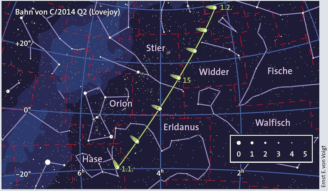 Lange Zeit war Lovejoy nur für Südhalbkugelbewohner sichtbar, doch er wandert nahezu senkrecht zur Ekliptik Richtung Norden und betritt kurz vor Weihnachten auch für Mitteleuropäer die Himmelsbühne. Am vergangenen Wochenende sichtete ihn der Kometenbeobachter Burkhard Leitner von Österreich aus – das erste Beobachtungsfenster hat sich damit bereits geöffnet. Noch bis zur Neujahrsnacht steigt C/2014 Q2 allerdings kaum über den Horizontdunst. Er durchschreitet die Sternbilder Columba (Taube) und Lepus (Hase) nordwärts. Am 2. Januar tritt er in das ausgedehnte Sternbild Eridanus über, in den ersten Nächten des neuen Jahres findet man ihn etwa 9 Grad südwestlich des hellen Sterns Rigel.