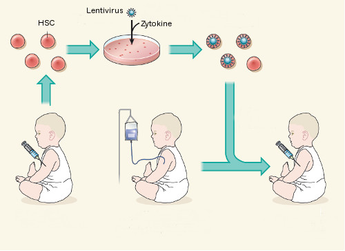 Befeuert wird der Optimismus jetzt durch zwei neue Studien [1, 2]. In beiden hatten Forscher sich das Lentivirus als Transduktions-Vektor zu nutze gemacht – und damit eine Methode, die immer stärkere Bedeutung für den Erfolg der Gentherapie zu gewinnen scheint [3]. Im Rahmen der Technik ernten Mediziner dabei zunächst einen bestimmten Stammzelltyp aus dem Körper der Patienten und fügen ein therapeutisches Gen hinzu, wobei sie sich eines Übertragungssystems (also eines Vektors) bedienen, das auf unbedenkliche Weise aus den Einzelteilen von HI-Viren zusammengebaut wird. Schließlich injizieren sie das modifizierte Zellkonstrukt wieder in den Körper zurück.