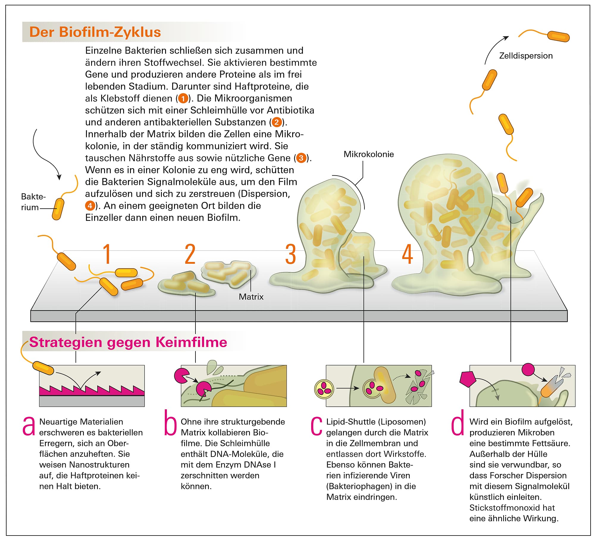 Das Problem resultiert vor allem aus einer falschen Strategie: Behandlungen bakterieller Infektionen richten sich gegen Einzelzellen, nicht gegen filmbildende Zellverbände. Letztere sind jedoch nicht nur in der Lage, unserer Immunabwehr auszuweichen, so dass Impfstoffe wirkungslos sind, häufig können ihnen auch Antibiotika nichts anhaben. Die hohe Widerstandsfähigkeit hat nichts mit tatsächlicher Wirkstoffresistenz zu tun oder gar mit der Entwicklung multiresistenter Erreger. Es ist die dreidimensionale bakterielle Matrix, die Biofilme so zäh macht. Darin eingebettet tauschen Bakterien Informationen aus, koordinieren die Organisation von Strukturelementen und unterstützen sich gegenseitig durch die Synthese von Proteinen und anderen überlebenswichtigen Molekülen.