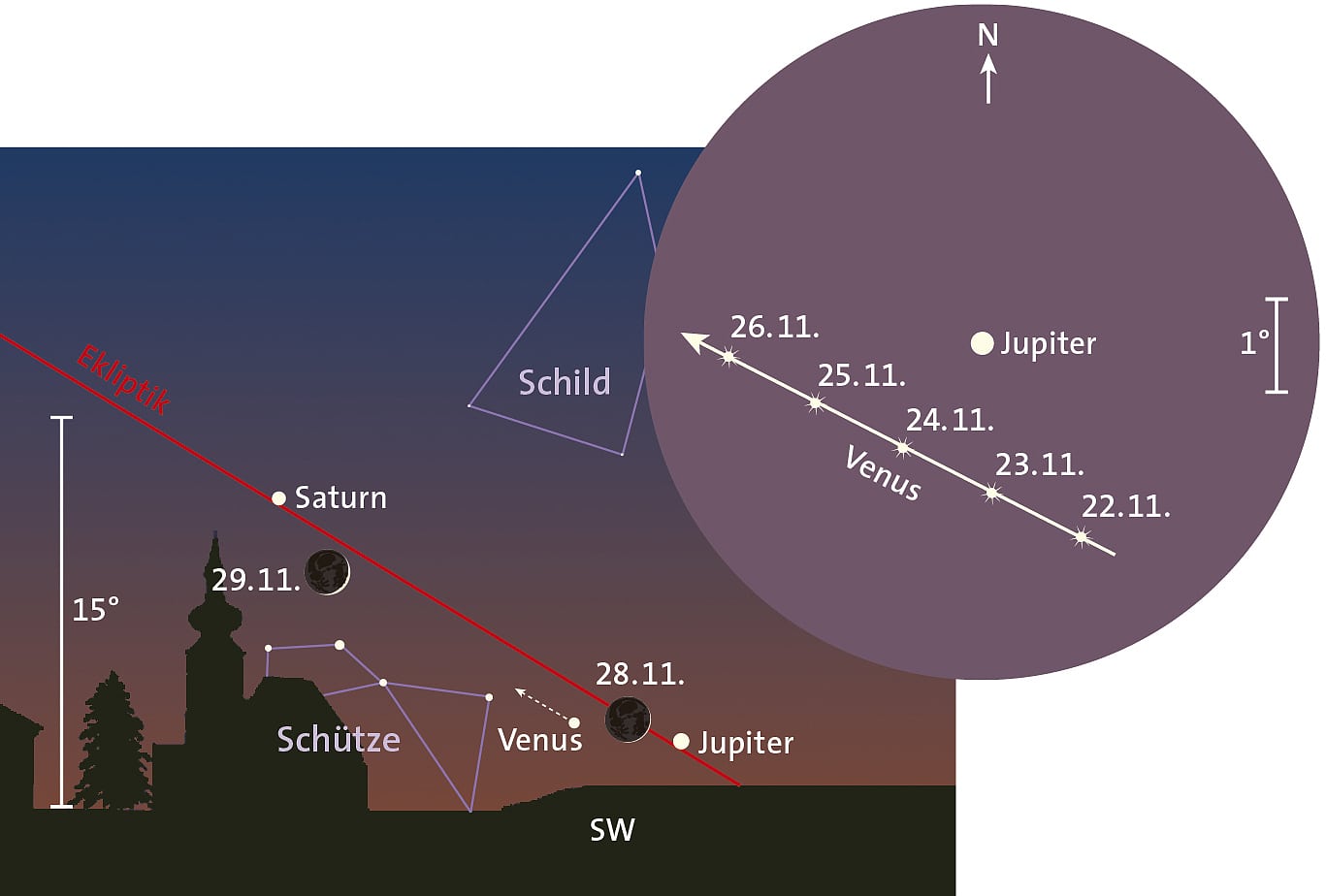 Venus betritt im Lauf des Monats die Himmelsbühne am Abendhimmel. Bei Ende der bürgerlichen Dämmerung – 17:35 Uhr am Monatsanfang und 17:03 Uhr am Monatsende – finden wir sie am 1. November nur 1,5 Grad, am Monatsletzten schon gut sechs Grad über dem Südwesthorizont. Mit einer scheinbaren Helligkeit von –3,9 mag ist Venus bei klarem Himmel als auffällig heller »Abendstern« zu sehen. Zum Monatsende nähert sich Venus dem –1,9 mag hellen Jupiter an – der engste Winkelabstand der beiden von 1,3 Grad wird am Abend des 24. November gegen 17:00 Uhr erreicht. Ein besonders hübscher Anblick bietet sich am Abend des 28. gegen 17:00 Uhr, wenn sich die gerade einmal zwei Tage alte Mondsichel zwischen die beiden Planeten drängt.