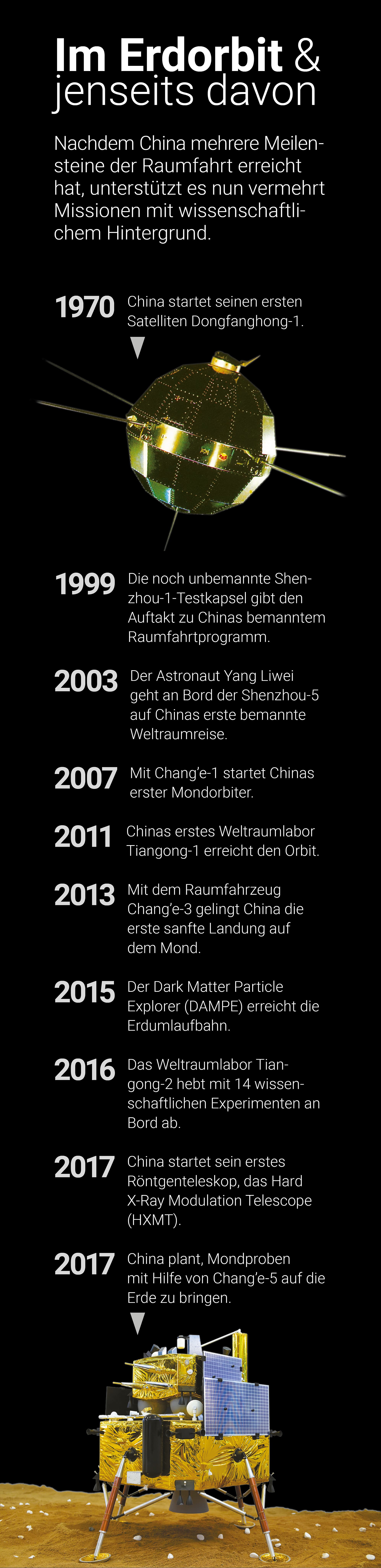 "Chinas Raumfahrtprogramm hat innerhalb kurzer Zeit enorme Fortschritte gemacht", sagt Michael Moloney, der die Gremien für Weltraum und Raumforschung an den amerikanischen National Academies of Sciences, Engineering, and Medicine in Washington D.C. leitet. Die Wissenschaft hat dabei immer mehr Raum eingenommen, nicht nur im Rahmen der Mond- und Planetenforschung der chinesischen Weltraumbehörde (China National Space Administration, CNSA), sondern auch der chinesischen Behörde für bemannte Raumfahrt. So beherbergt das neueste Weltraumlabor des Landes – Tiangong-2, was so viel wie Himmelspalast 2 bedeutet – eine ganze Reihe wissenschaftlicher Geräte, einschließlich einer hochmodernen Atomuhr und dem fast drei Millionen Euro schweren POLAR-Detektor für die Untersuchungen von Gammastrahlung, sprich Wellen hochenergetischer Strahlung aus kollabierenden Sternen und anderen Quellen.