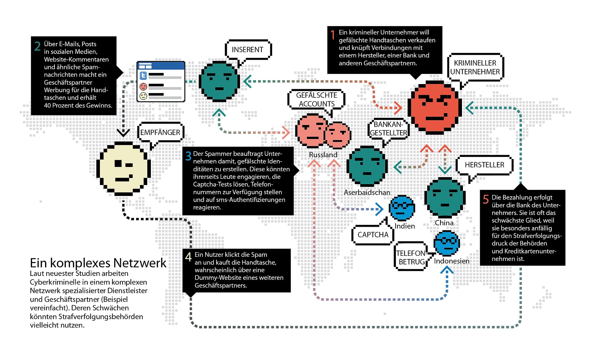 Dieses Geschäftspartnermodell fanden auch Savage und etliche andere in ihren Untersuchungen. Es scheint offensichtlich in vielen Bereichen der Cyberkriminalität angewendet zu werden, sei es im Verkauf von Handtaschenimitaten oder im Versand von Ransomware, sprich Erpressungssoftware, wie auch Datenklau von Kreditkarten und andere Formen des Cyberdiebstahls. Alle werden durch dieselben Dienstleister einer im Untergrund agierenden Schattenwirtschaft unterstützt – das Versenden von Spam-E-Mails ist da nur eine der Aktivitäten. Darunter fallen auch indische Firmen, deren Mitarbeiter den ganzen Tag Zeichen in Captchas eingeben, um so vorzutäuschen, ein Mensch sei am Werk und nicht ein Computer. Nicht zuletzt zählt auch eine immer häufiger auftretende Variante von Spam dazu, die als so genannte search-engine poisoning (deutsch etwa Suchmaschinen-Vergiftung) bekannt ist, bei der Benutzer seriös aussehende Suchergebnisse anklicken und dabei auf Schad-Websites umgeleitet werden.