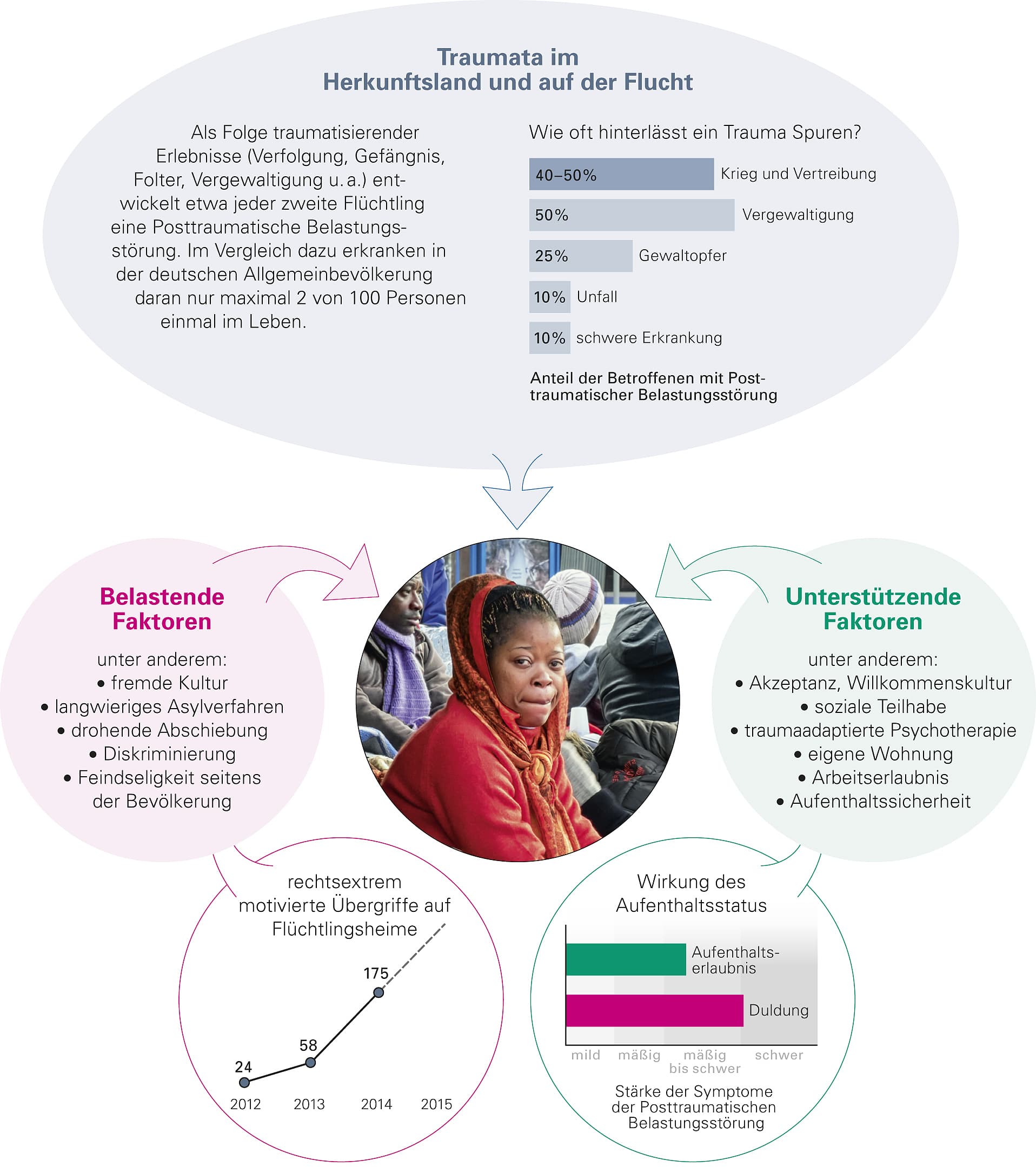 Zunächst müssen viele Asylsuchende die traumatischen Erlebnisse verarbeiten, die sie vor und während ihrer Flucht, teils auch nach ihrer Ankunft in Deutschland erlebt haben. 2011 folgerten deutsche Traumaforscher aus der Studienlage, dass rund die Hälfte aller Flüchtlinge die Erfahrungen von Krieg und Vertreibung nicht überwindet, sondern eine Posttraumatische Belastungsstörung (PTBS) entwickelt (siehe "Schlüsselbegriffe"). Sie entsteht verzögert, erst Monate, manchmal auch Jahre später, und beeinträchtigt Denken und Fühlen oft so stark, dass die Betroffenen sich aus dem sozialen Leben zurückziehen.