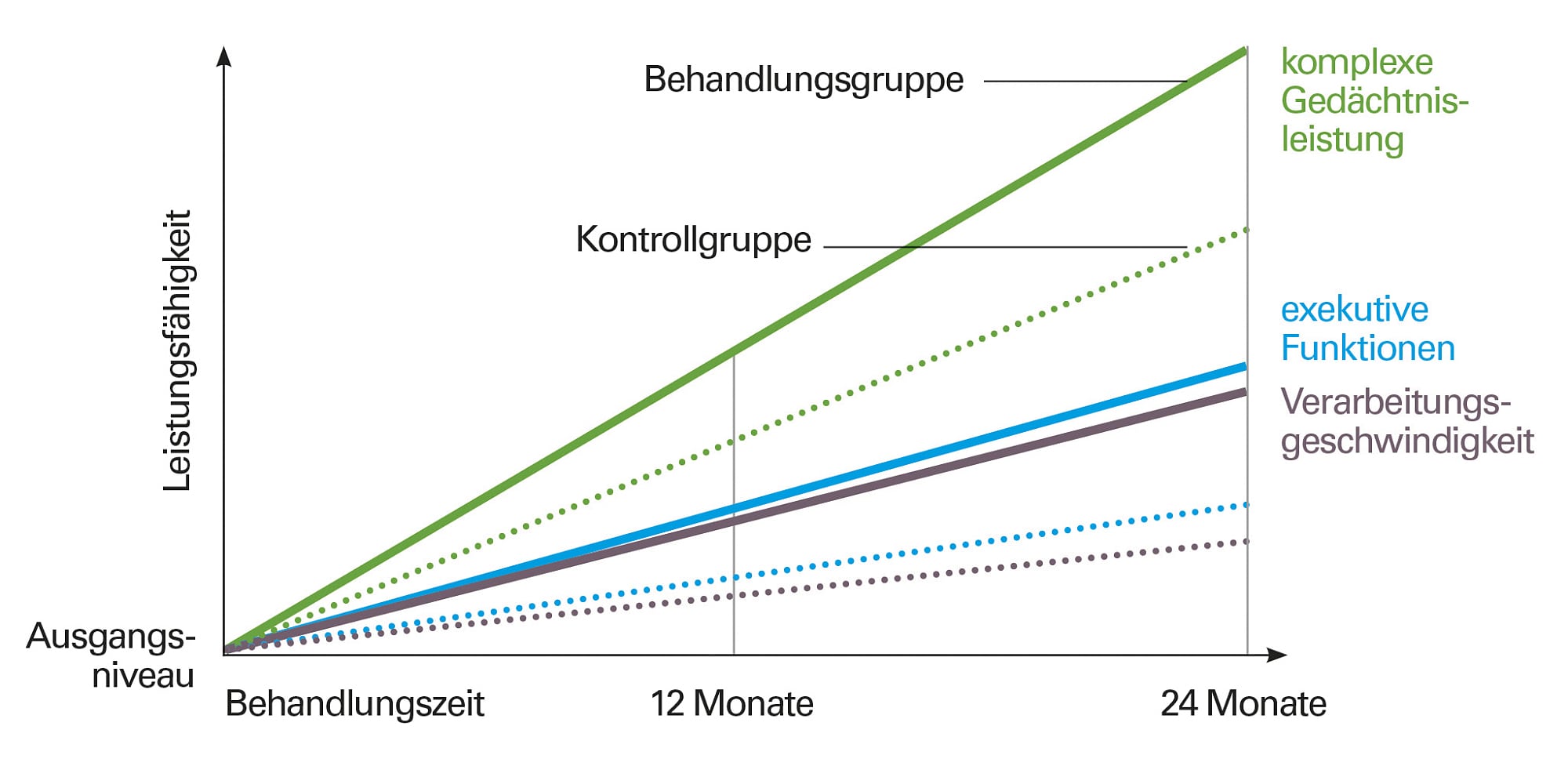 Dennoch lagen insbesondere die spezifischen Leistungssteigerungen in der Behandlungsgruppe um ein Vielfaches höher: Bei komplexen Gedächtnisaufgaben wie dem Auswendiglernen langer Listen war sie um 40 Prozent überlegen, hinsichtlich der exekutiven Funktionen um 83 Prozent, und in der mentalen Verarbeitungsgeschwindigkeit (die Zeit, die es braucht, um Denkaufgaben zu lösen) schlug sie die Kontrollgruppe sogar um 150 Prozent.