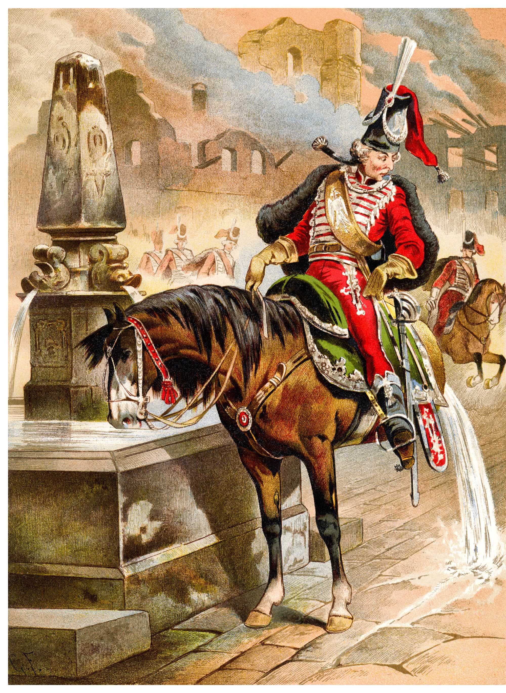 Hieronymus also erblickte vor gut 300 Jahren, am 11. Mai 1720, in Bodenwerder an der Weser im Kurfürstentum Braunschweig-Lüneburg das Licht der Welt. Er war Spross der so genannten schwarzen Linie des alten Adelsgeschlechts Münchhausen. Im Alter von 13 Jahren schickte ihn seine Familie entsprechend den Gepflogenheiten seines Standes und seiner Zeit als Page an den braunschweigischen Hof nach Wolfenbüttel. Im Winter 1737 brach der junge Mann schließlich nach Russland auf, um dort im Gefolge des Herzogs Anton Ulrich von Braunschweig sein Glück zu machen. Er trat 1739 als Fähnrich in dessen nahe Riga stationiertes Regiment, die Braunschweig-Kürassiere, ein und folgte seinem Herrn in den Russisch-Österreichischen Türkenkrieg.