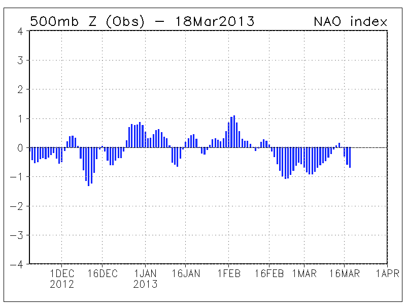Es handelt sich tatsächlich um ein eher träges System, das sich nicht im Tagesrhythmus verändert. Man kann schon mittelfristig erkennen, ob der Trend eher negativ oder eher positiv verläuft. Daraus jedoch mehr als Monatsprognosen für das Wetter abzuleiten, ist nicht zulässig. Denn betrachtet man beispielsweise die letzten drei Monate, so sieht man doch einen Wechsel zwischen positiven und negativen Phasen – das kann also relativ schnell gehen. Wir können also überhaupt noch nicht absehen, wie der Frühling oder der Sommer wird: Die Fehlerquelle ist einfach zu groß.