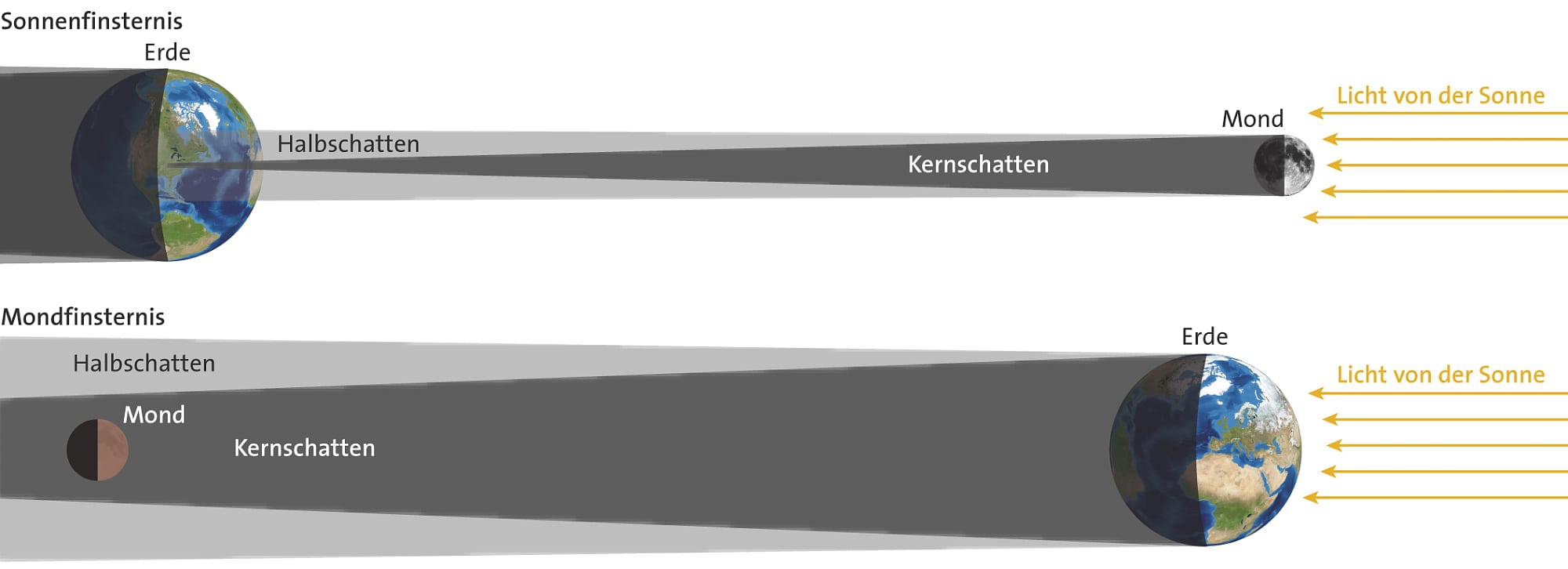 Am 31. Januar ereignet sich zum Monatsschluss eine totale Mondfinsternis. Die Dauer der Totalität ist zwar mit rund 77 Minuten sehr lang, die Finsternis findet aber von 13:51 bis 15:08 Uhr MEZ statt und ist für uns hier in Europa leider nicht sichtbar, da sich der Mond dann weit unter dem Horizont auf der anderen Seite der Erde befindet. Eine Mondfinsternis entsteht, wenn der Erdschatten auf den Mond fällt. Das ist also nur bei Vollmond möglich, wenn Mond, Erde und Sonne annähernd in einer Reihe stehen. Man unterscheidet dabei zwischen dem Halbschatten und dem Kernschatten. Bei Letzterem würde für einen Astronauten auf dem Mond die Erde die Sonne komplett bedecken. Allerdings wäre die Erde dann von einem schmalen rötlichen Ring umgeben. Diesen Effekt bewirkt die Erdatmosphäre, die das Sonnenlicht bricht und streut. Somit wird der Mond im Kernschatten nicht völlig schwarz, sondern leuchtet in einem dunklen Rot. Im Halbschatten ist die Sonne nur teilweise von der Erde bedeckt, was sich in einer geringfügigen Verdunklung von Teilen der Mondscheibe vor dem Eintritt in den Kernschatten zeigt. Die Erde ist rund viermal so groß wie der Mond. Dadurch ist ihr Schatten in Mondentfernung deutlich größer als der Durchmesser des Erdtrabanten und bedeckt ihn bei einer totalen Mondfinsternis vollständig. Zudem dauert eine Mondfinsternis beträchtlich länger als eine totale Sonnenfinsternis, die nur einen schmalen Streifen auf der Erdoberfläche erfasst. Um eine Mondfinsternis zu beobachten, sind keine besonderen Sicherheitsmaßnahmen notwendig wie bei einer Sonnenfinsternis – es sei denn, man befände sich gerade auf dem Mond.