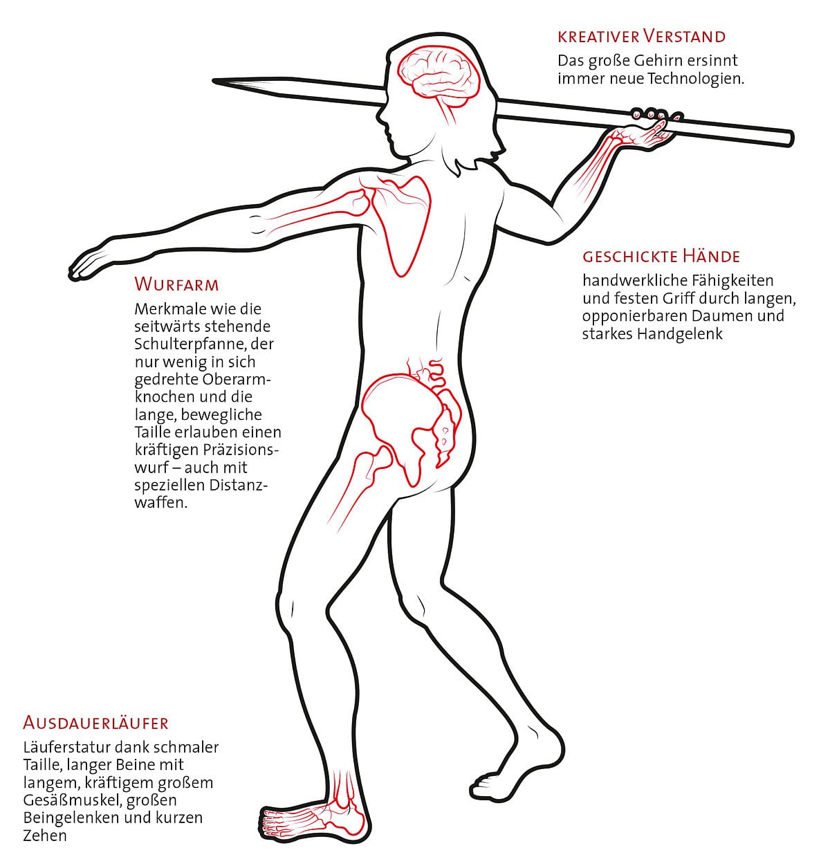 Eine Reihe anatomischer Anpassungen machte diese unsere Vorfahren zu ernstlichen Konkurrenten der Säbelzahnkatzen und anderer großer Raubtiere der afrikanischen Savannen, die dort bisher unangefochten geherrscht hatten. Zum Beispiel kann ein Mensch auf seinen zwei Beinen im Vergleich zu anderen Raubtieren zwar nicht besonders schnell sprinten – aber das macht er mit seinem hohen Ausdauervermögen wett, das den anderen Arten und oft auch den Beutetieren in der Regel fehlt. Ein Mensch könnte ein Pferd im Marathon schlagen. Ähnliches leistet kein anderer heutiger Primat auch nur annähend. Laut Daniel Lieberman von der Harvard University in Cambridge (Massachusetts) und Dennis Bramble von der University of Utah in Salt Lake City könnten frühe Menschen ihre Beute bis zur völligen Erschöpfung getrieben haben. Fossilien zeigen, dass die hierfür wichtigen anatomischen Voraussetzungen im Körperbau – unter anderem Beine mit kurzen Zehen, großen Gelenkoberflächen und einer langen Achillessehne – bereits vor etwa zwei Millionen Jahren entstanden. Schon damals dürften Menschen immer mehr zu Ausdauerläufern geworden sein.