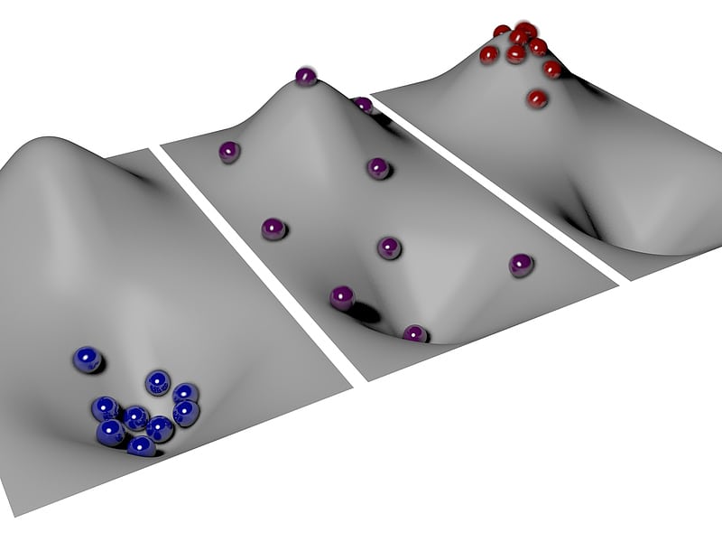 Dieses Wölkchen würde normalerweise mit der Zeit auseinanderdriften, denn die Kaliumatome stoßen sich von Natur aus ab. Das verhinderten die Experimentatoren mit einer Kombination aus Magneten, elektrischen Feldern sowie einem dreidimensionalen optischen Gitter aus gekreuzten Laserstrahlen. Die elektromagnetischen Felder der Laser erzeugen eine regelmäßige Struktur, deren Periodizität und Tiefe die Forscher nach Wunsch variieren konnten. Mit den elektrischen Feldern der Atomfalle konnten die Wissenschaftler diese Struktur zudem nach "unten" oder "oben" verbiegen, so dass über das gesamte Raumgebiet entweder ein großes "Tal" entstand, was eine anziehende Wechselwirkung bedeutet, oder ein "Berg", was einer abstoßenden Wechselwirkung entspräche. Mit dem Magnetfeld konnten die Forscher um Ulrich Schneider ferner einstellen, ob sich die Kaliumatome ganz natürlich abstoßen oder doch anziehen. Dass sich die Wechselwirkung zwischen Atomen in einem optischen Gitter mit Hilfe eines Magnetfelds einstellen lässt, ist eine Besonderheit quantenmechanischer Objekte, die österreichische Physiker bereits vor einigen Jahren herausgefunden haben.