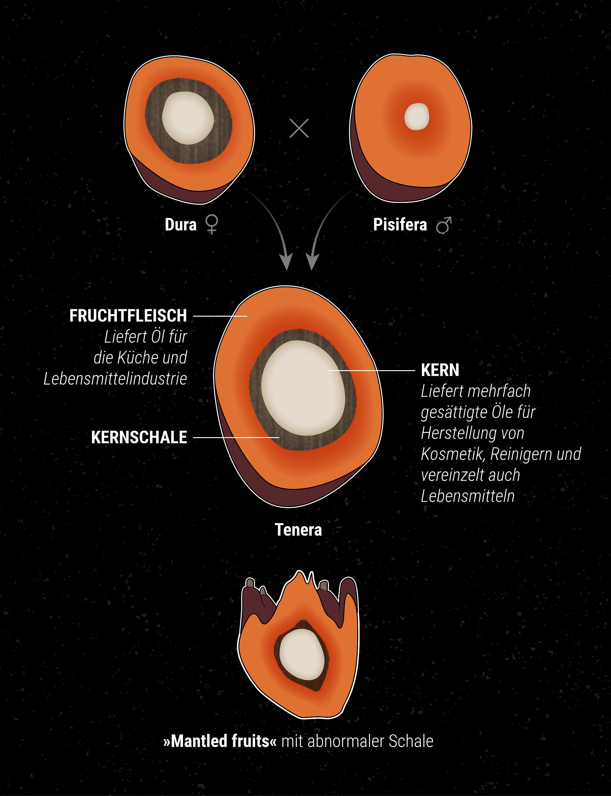 Auch wenn sich die Pflanzen in ihrer äußeren Erscheinung größtenteils gleichen, gibt es bei Ölpalmen drei verschiedene Fruchtformen – Dura, Pisifera und Tenera –, die sich zudem stark in ihrer Ölausbeute unterscheiden. Aus den Samen des Dura-Typs wachsen Pflanzen heran, deren Früchte eine dicke Kernschale besitzen und die nur wenig Öl liefern. Palmen des Pisifera-Typs sind zuweilen unfruchtbar, doch wenn sie Früchte produzieren, fehlt diesen häufig eine Kernschale. Tenera, eine Hybride aus Pisifera und Dura, entwickelt Früchte mit einer feinen, dünnen Kernschale, aus denen sich reichlich Öl gewinnen lässt. Das für die Dicke der Kernschale verantwortliche Gen – es trägt übrigens den sehr einfallsreichen Namen SHELL – wurde 2013 von Forschern der Firma Orion, des Cold Spring Harbor Laboratory in New York sowie des Malaysian Palm Oil Board (MPOB), eines Forschungsinstituts der malaysischen Regierung mit Sitz in Kuala Lumpur, identifiziert.