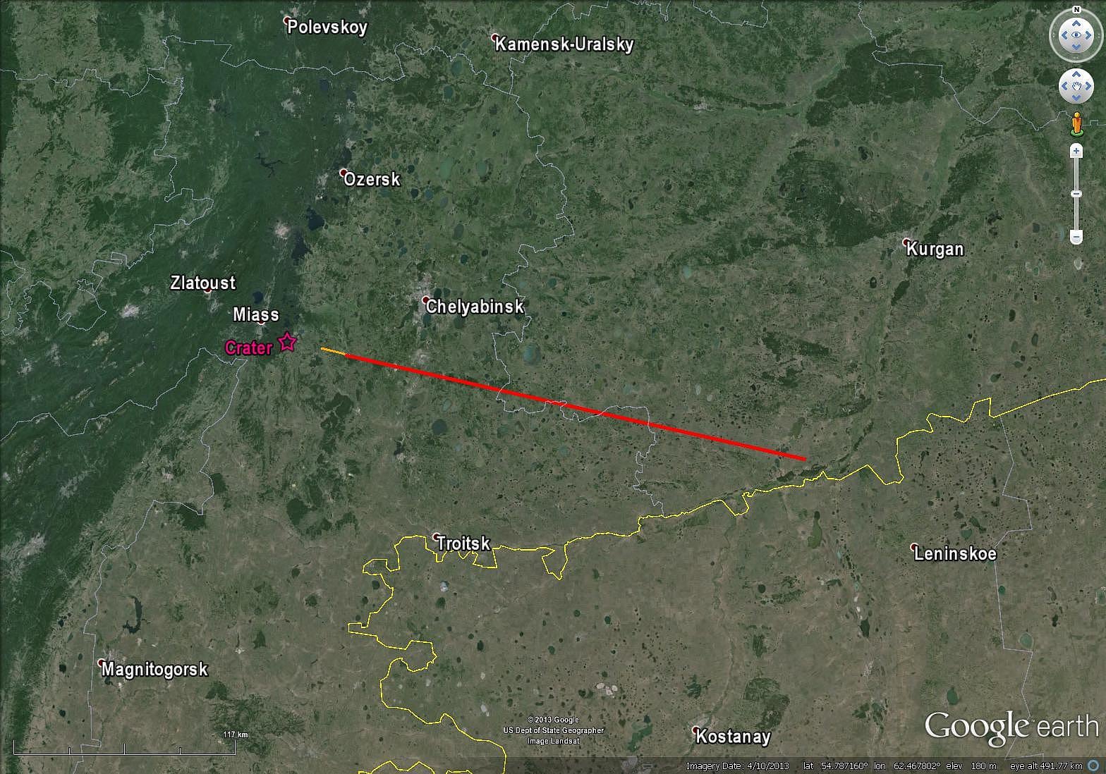 Neben dem Trajektorium des Boliden in der Erdatmosphäre interessierte die Forscher um Borovicka auch die Bahn des Himmelskörpers durch unser Sonnensystem vor dem Einschlag. Aus den Bildern konnten sie seine Bahn rekonstruieren und stellten fest, dass sie derjenigen des Asteroiden 86039 (1999 NC43) sehr ähnlich ist. Sie vermuten daher, dass der Bolide von Tscheljabinsk tatsächlich ein Bruchstück dieses rund 2,2 Kilometer großen Asteroiden ist. Sie gehen von einer Wahrscheinlichkeit von 1 : 10 000 aus, dass die Übereinstimmung der Bahnen nur rein zufällig ist. Bislang konnte nur von 18 beim Fall beobachteten Meteoriten ihre vorherige Bahn durch das Sonnensystem rekonstruiert werden, aber noch nie fand sich eine derartige Ähnlichkeit mit der Bahn eines bereits bekannten Asteroiden.