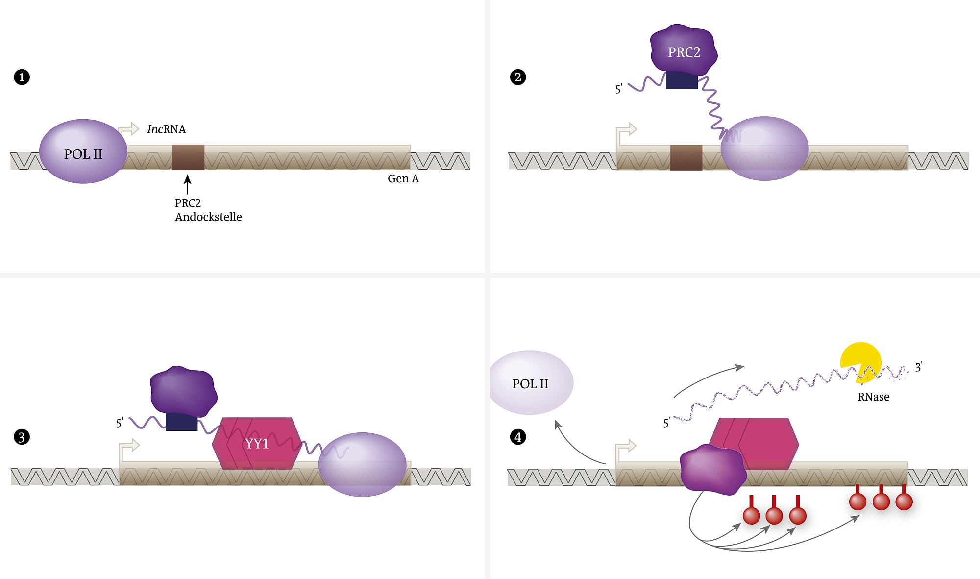 Neben der in ihrer Kurzlebigkeit und damit geringen Reichweite liegenden Allelspezifität sind lncRNAs aber womöglich auch extrem genaue Wegweiser für allerlei Spezialenzyme, die nur an einem ganz bestimmten Genort andocken sollen. Der Grund ist simpel: Die langen RNAs sind länger; sie können somit mehr und spezifischere Informationen enthalten und solchen Spezial-Regulationsproteinen als exakteres Signal dienen. Auch hierbei wirken lncRNAs wie die oben beschriebene Xist-RNA streng lokal: Noch während sie gebildet wird, dockt das zuständige PRC2-Enzym an die spezifische Bindestelle in der lncRNA an, wird damit auch an den Genort angekettet und beginnt genau hier mit seiner Aufgabe, in diesem Fall der epigenetischen Markierung.