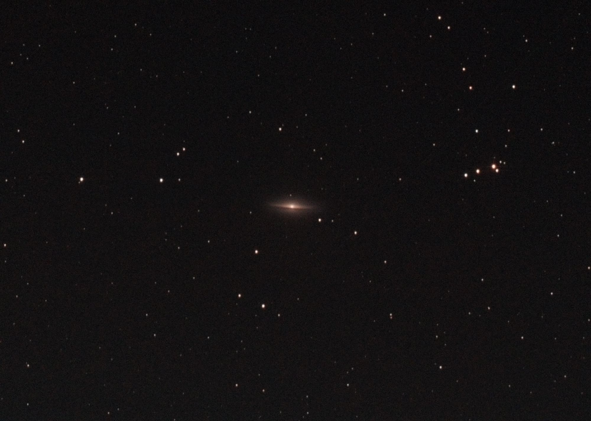 Die Sombrero-Galaxie Messier 104 steht auch annähernd in Kantenlage. Ein wenig sieht man jedoch noch von ihrer Scheibe. Ihre Form ist besonders kurios, da sie im Prinzip nur aus einem großen Ring besteht, in der Mitte liegt ein helles, diffuses Zentrum. Das Licht der Sterne wird durch die Staubwolken im äußeren Bereich geschluckt, wodurch eine dunkle Teilung entsteht.