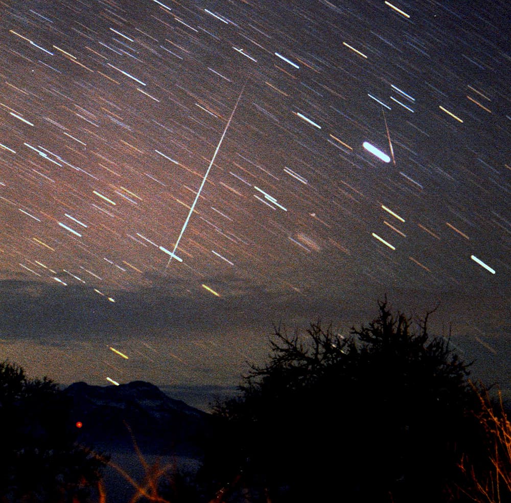 Geminiden | Zwei schöne Geminiden-Meteore lichtete Erwin Filimon im Dezember 2002 ab. Das Bild ist eine länger belichtete Aufnahme, daher erscheinen die Sterne zu kurzen Strichen ausgezogen. Der hellste von ihnen ist Sirius im Sternbild Großer Hund.