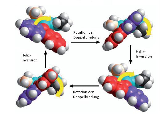 Die ineinander verschlungenen Moleküle von Stoddart und Sauvage erfüllten die zentrale Anforderung eine molekularen Maschine. Ihre Teile müssen zwar zusammenhängen, aber gleichzeitig gegeneinander beweglich sein. Doch das allein reicht noch nicht aus: Eine Maschine muss auch etwas tun - so wie der rotierende Motor von Feringa. Im Jahr 1994 gelang es dann beiden Wissenschaftlern unabhängig voneinander, ihre Molekülkonstrukte von außen in Bewegung zu versetzen.