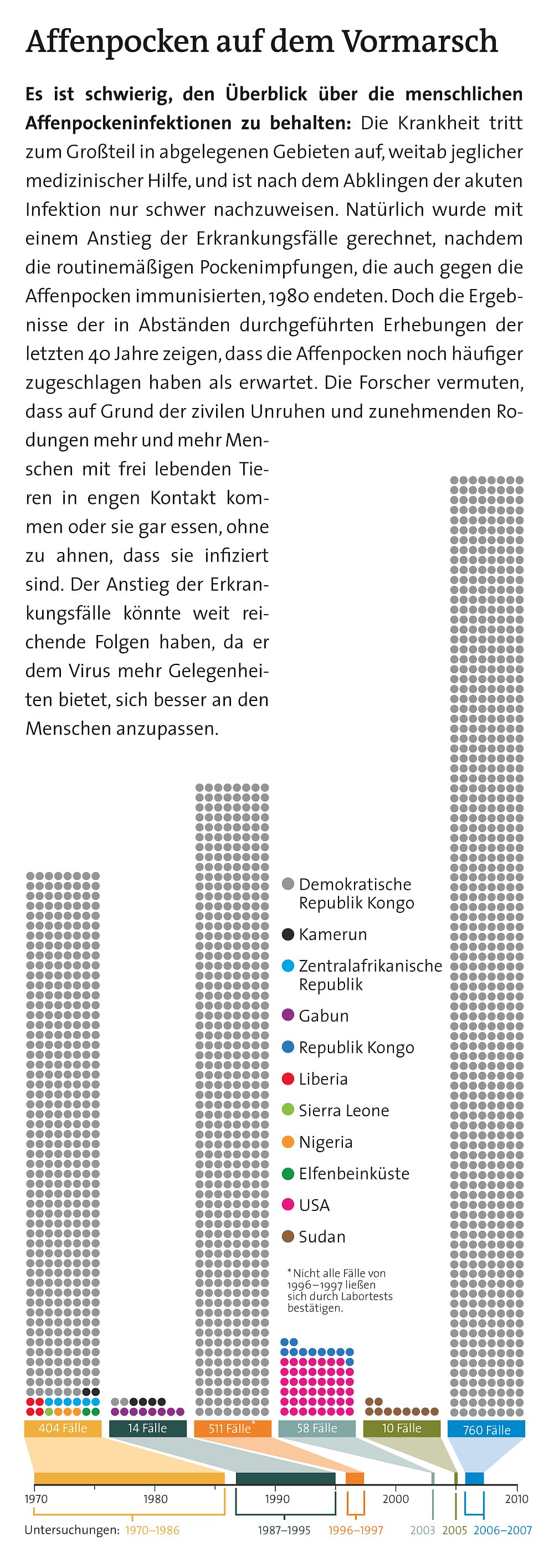 Die Ergebnisse waren alarmierend. Im Vergleich zu ähnlichen Daten, welche die Weltgesundheitsorganisation von 1981 bis 1986 gesammelt hatte, stellte Rimoin einen 20-fachen Anstieg in der Anzahl von menschlichen Affenpockenerkrankungen fest. Trotzdem glaubt sie, dass ihre 2010 veröffentlichten Daten immer noch deutlich zu tief gegriffen sind. "Es ist nur die Spitze des Eisbergs", sagt sie. Schließlich hatte die WHO vor 30 Jahren eine viel größere und besser finanzierte Suche nach den Affenpocken durchgeführt. Rimoins Team hat zweifellos noch deutlich mehr Fälle übersehen als diese frühere, umfangreichere Studie. Auch wenn der Anstieg an Erkrankungen größer war als erwartet, kam er nicht ganz überraschend. Schließlich ist der Großteil der Bevölkerung nicht gegen Pockenviren geimpft – die Demokratische Republik Kongo stoppte die Impfungen im Jahr 1980.