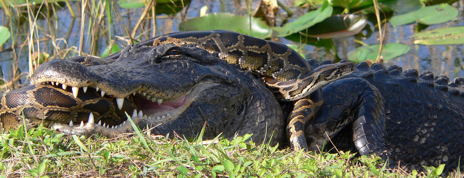 Der Kampf der Titanen endete für beide Seiten tödlich: Nachdem der vier Meter lange Tigerpython den Alligator erdrosselt hatte und zu verschlingen begann, zerriss es ihm durch die überdimensionierte Beute den Leib. Für die Ranger, die beide Reptilien kurze Zeit später entdeckten, war der Anblick ebenso bizarr wie erschreckend – ein Hinweis, dass die unangefochtene Stellung des amerikanischen Mississippi-Alligators an der Spitze der Nahrungskette in den Everglades nicht mehr länger gilt: Ein Neuankömmling macht ihm diese Stellung streitig. Und er verändert die Mutter aller Sümpfe im Süden Floridas womöglich umfassender, als es Umweltverschmutzung oder Wasserbau je konnten.