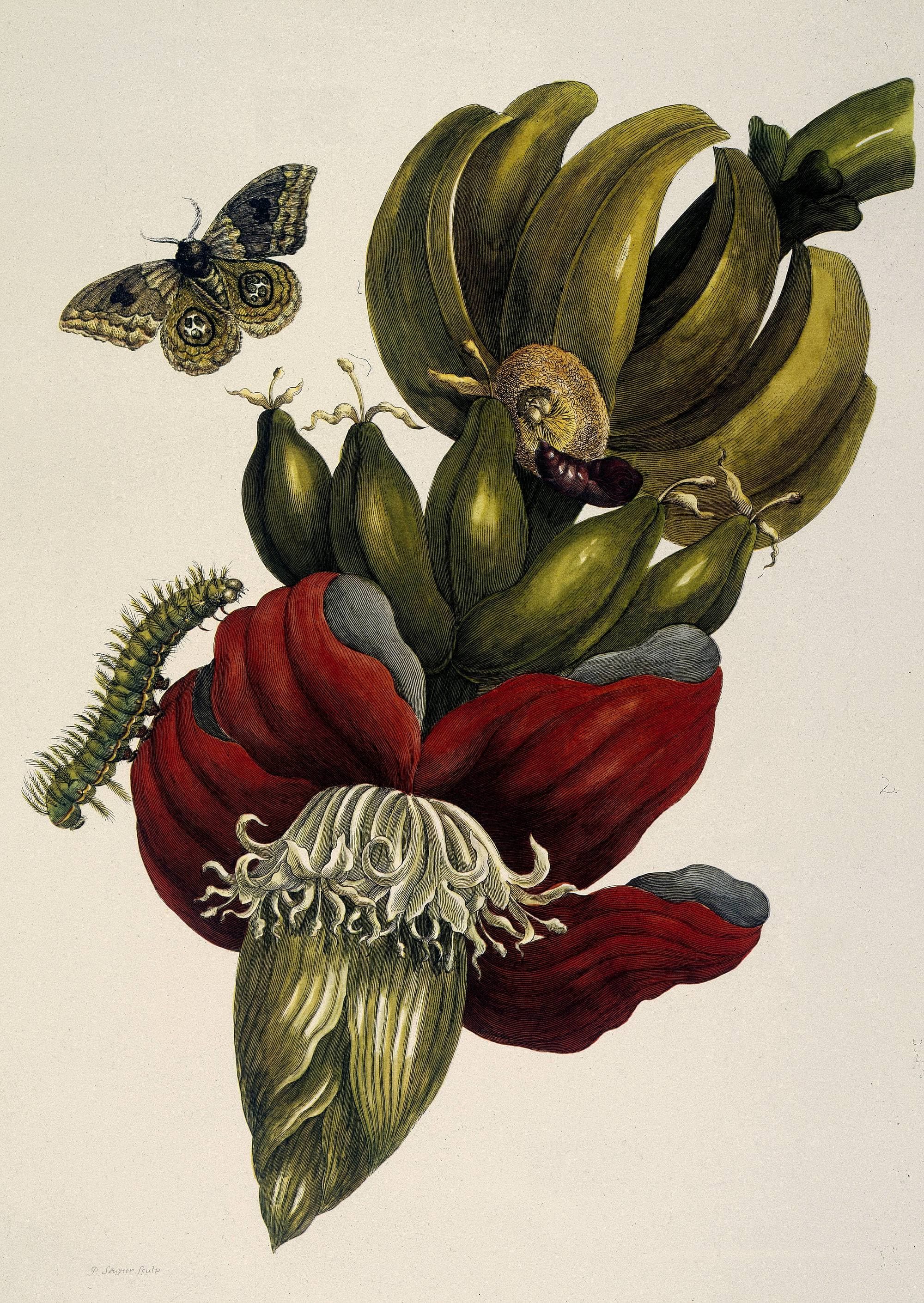 Metamorphosis insectorum surinamesium erschien 1705, eine Sammlung von kunstvoll kolorierten Kupferstichen und erläuternden Texten, in denen sie die gesamten Lebenszyklen der Insekten in ihrer natürlichen (Pflanzen-)Umwelt darstellte und beschrieb. Ein Opus magnum, sozusagen. Mit ihren 52 Jahren (nach den Begriffen der Zeit bereits eine alte Frau) war sie dafür nur in Begleitung ihrer jüngsten Tochter Dorothea Maria weit gereist. Das war unerhört und sorgte für Gesprächsstoff in der damaligen niederländischen Kolonie Surinam. Die Einwohner waren strenge Calvinisten und pragmatische Zuckerrohrfarmer. Sie hielten die beiden Neuankömmlinge, die sofort damit begannen, Raupen und andere Insekten zu sammeln, um diese zu studieren und zu zeichnen, für wunderlich, wenn nicht gar für verrückt oder der Hexerei verdächtig.