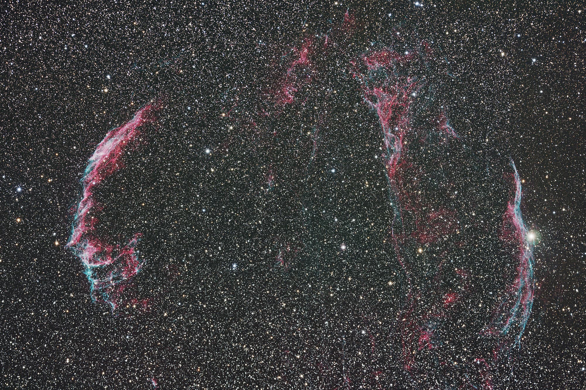 Zum Schluss noch eines der schönsten Objekte des Sommerhimmels, wenn nicht sogar das schönste: der Zirrusnebel. Hier gilt, je größer die Teleskopöffnung, desto besser. Aber er bereitet tatsächlich in allen Teleskopgrößen Freude. Der Zirrusnebel ist ein Supernova-Überrest, der rot und blau leuchtet. Er befindet sich am unteren Flügel des Schwans und besteht hauptsächlich aus drei Teilen – dem Sturmvogel (einer leicht s-förmigen Struktur am Stern 52 Cygni), der Knochenhand, die wirklich genau so aussieht, wie sie heißt, und dem Dreieck zwischen den beiden, dessen untere Spitze sich weit über die komplette Länge des Nebels erstreckt. Den Zirrusnebel muss man einfach mal mit eigenen Augen im Teleskop gesehen haben. Mit größeren Teleskopen ab 25 Zentimeter Öffnung kann man feinste Filamente und Strukturen im Nebel beobachten. Ein Nebelfilter hilft hier enorm und lässt den Nebel richtig plastisch wirken. Bei kleinen Teleskopen und/oder schlechtem Himmel entscheidet er über Sehen und Nichtsehen.