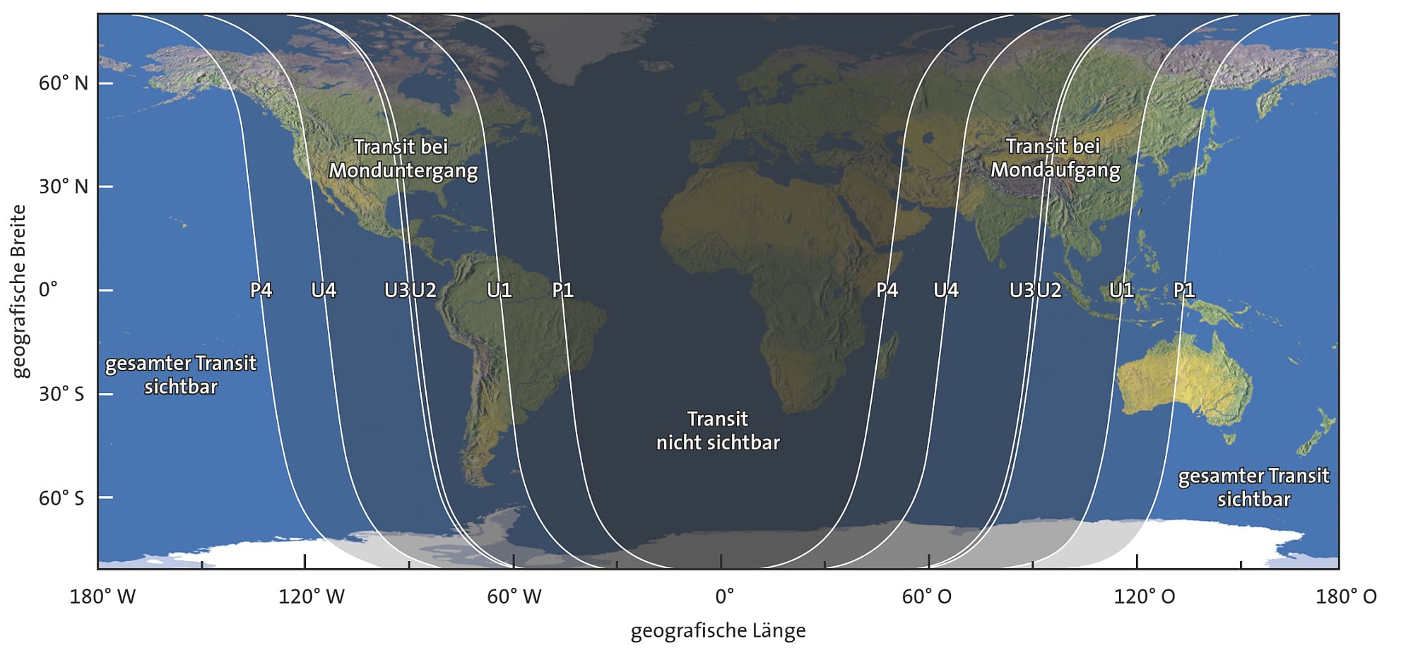 Ein Tipp für die Fernreisenden ist die totale Mondfinsternis vom 4. April 2015. Von Mitteleuropa aus ist sie nicht zu sehen, weil der Mond zur fraglichen Zeit unter dem Horizont steht. Dagegen kommen die Bewohner rund um den Pazifikraum in den Genuss dieses Himmelsereignisses (China, Japan, Australien, Neuseeland und der Westen Nordamerikas). Ungewöhnlich an dieser Mondfinsternis ist die mit knapp fünf Minuten geringe Dauer der totalen Phase, denn der Vollmond läuft nur durch den obersten Rand des irdischen Kernschattens.