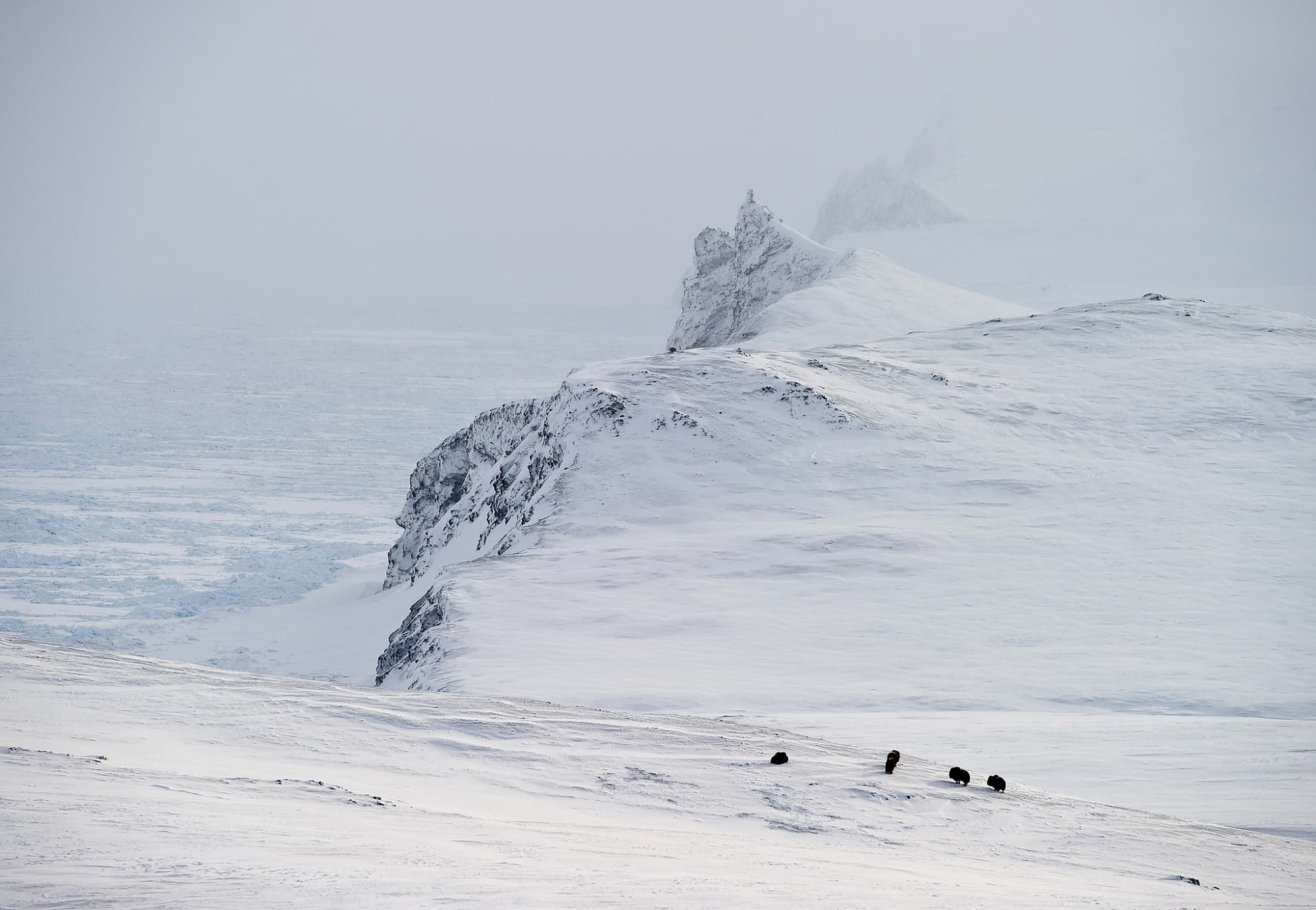 Ein steifer Wind warf den Hubschrauber hin und her, als er in der Nähe des Kiesstrands auf der Wrangelinsel zur Landung ansetzte. Das abgeschiedene Fleckchen Erde befindet sich etwa 480 Kilometer nördlich des Polarkreises im äußersten Winkel des russischen Föderationskreises Ferner Osten. Nach einem zweieinhalbstündigen Flug, der in der Stadt Pewek in Russland begann und größtenteils über offenes Meer führte, roch es im Helikopter nach Wodka und Treibstoff aus den Reservekanistern, die im Inneren der Kabine befestigt waren. Forschend hielt Joel Berger in den ringsherum aufragenden weißen Hügeln Ausschau und entdeckte schließlich an ihren Hängen einige schwarze Tupfen: Moschusochsen – seine Forschungsobjekte.