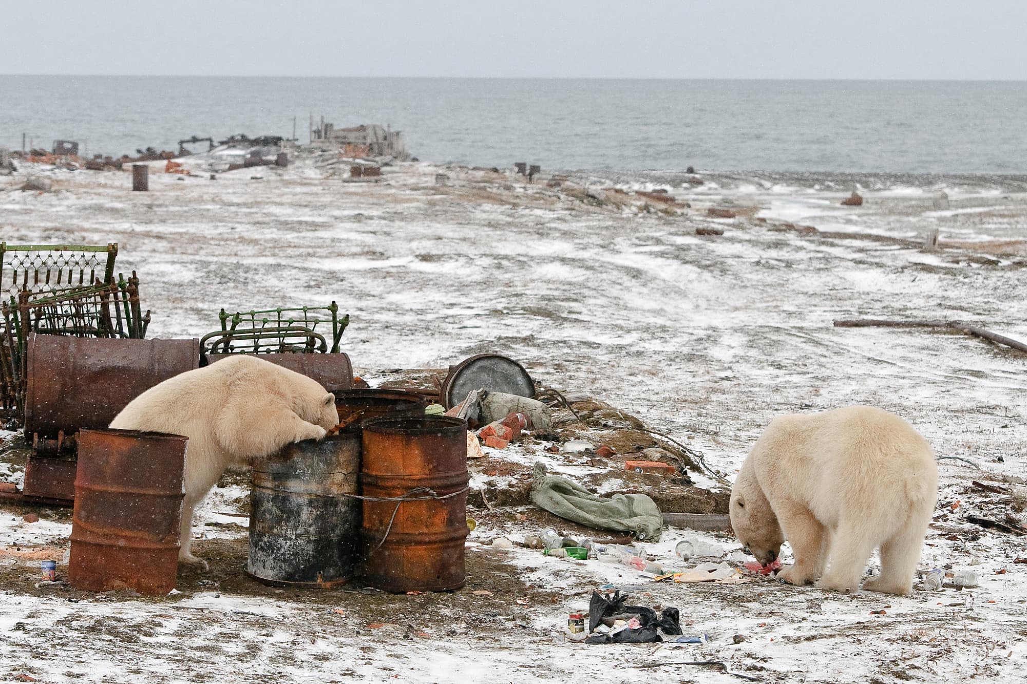 Auf dem Eis ernähren sich die Bären von den fettreichen Robben, die sie bei ihren Jagdzügen erbeuten. Wenn sich die Weibchen an Land begeben, um ihre Jungen zu gebären, beginnt für sie normalerweise eine Zeit des Fastens. Das zurückweichende Meereis zwingt die Eisbären jetzt allerdings dazu, frühzeitiger Land aufzusuchen und dort länger als gewöhnlich zu verweilen. Für die Bärinnen ist es jedoch nahezu unmöglich, diese ausgedehnten Hungerperioden zu überstehen und gleichzeitig erfolgreich Nachwuchs zur Welt zu bringen. Vereinzelte Belege deuten darauf hin, dass die Tiere ihre Ernährungsgewohnheiten an die veränderten Bedingungen anpassen, doch noch ist den Wissenschaftlern nicht ganz klar, welche Folgen dies haben könnte – sowohl für die Bären als auch für das gesamte Ökosystem. Im Jahr 2015 beobachteten Wildhüter auf der Wrangelinsel, wie ein Eisbär eine Gruppe am Strand liegender Walrösser hetzte, ganz offensichtlich in der Absicht, eine Massenflucht anzuzetteln und sich nachfolgend die verletzten oder getöteten Tiere herauszupicken. Gruzdev berichtet, er habe zudem beobachtet, wie Eisbären Moschusochsen, Rentiere und Wale erbeuteten und sogar die Erdhöhlen von Lemmingen auf der Suche nach den winzigen Nagetieren ausgruben.