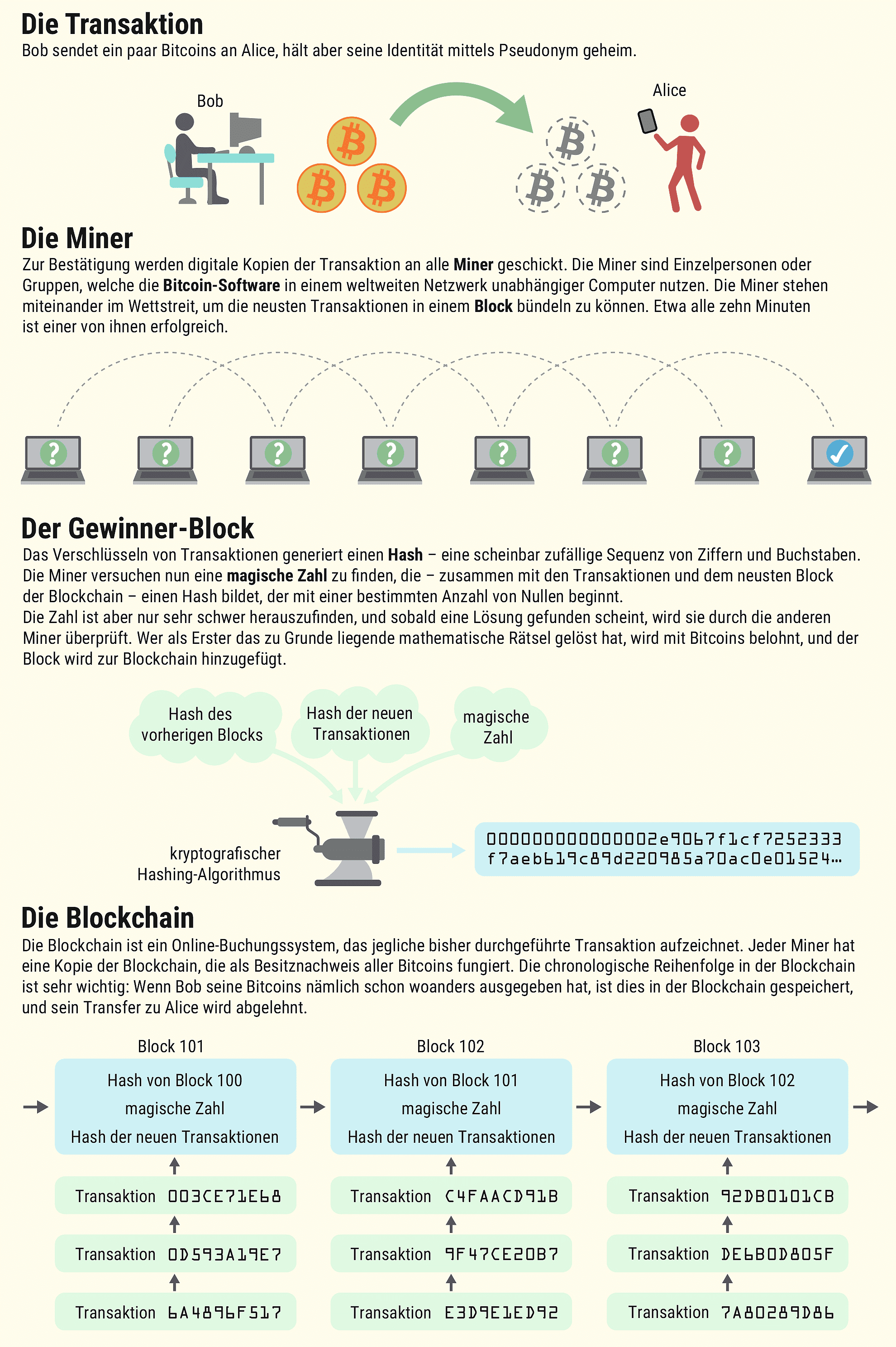 Das Mining startet mit eintrudelnden Bitcoin-Transaktionen, die konstant auf alle Computer des Netzwerks geleitet werden. Die Transaktionen werden von den "Minern" gesammelt, die sich als Gruppe oder Einzelperson beteiligen können und um die Rechte wetteifern, die Transaktionen in einem neuen Block zu bündeln. Gewinner ist, wer als Erster einen "Proof-of-Work" sendet, das heißt die Lösung für ein eigentlich unwichtiges mathematisches Problem, das verschlüsselte Daten aus dem vorherigen Block und viele Rechenversuche sowie Errors oder Fehlversuche enthält. Der Gewinner-Block wird über das Bitcoin-Netzwerk geschickt und zur Blockchain hinzugefügt; das Proof-of-Work ist dabei der unzerstörbare Link. So ist die immer weiter wachsende Blockchain derzeit schon fast 400 000 Blöcke lang.
