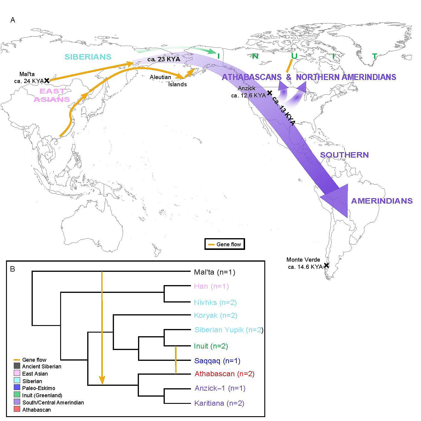 Angehörige dieser Population spalteten sich um den Höhepunkt der letzten Eiszeit herum, also vor frühestens 23 000 Jahren, von ihrer eigenen Ausgangspopulation in Sibirien ab und wanderten über die damals trockenliegende Beringstraße ein. Wie lange sie sich dort aufhielten und auf welchen Routen sie an den damals gewaltigen kanadischen Inlandseisschilden vorbei südwärts wanderten, geht aus den Gendaten nicht genau hervor. Willerslev und Kollegen errechneten allerdings eine kürzere Verweildauer als Vertreter des "Beringian Incubation Model", dem zufolge sich die Ursprungspopulation über 15 000 Jahre lang auf der Landbrücke aufhielt und dort ihrerseits aufsplittete.