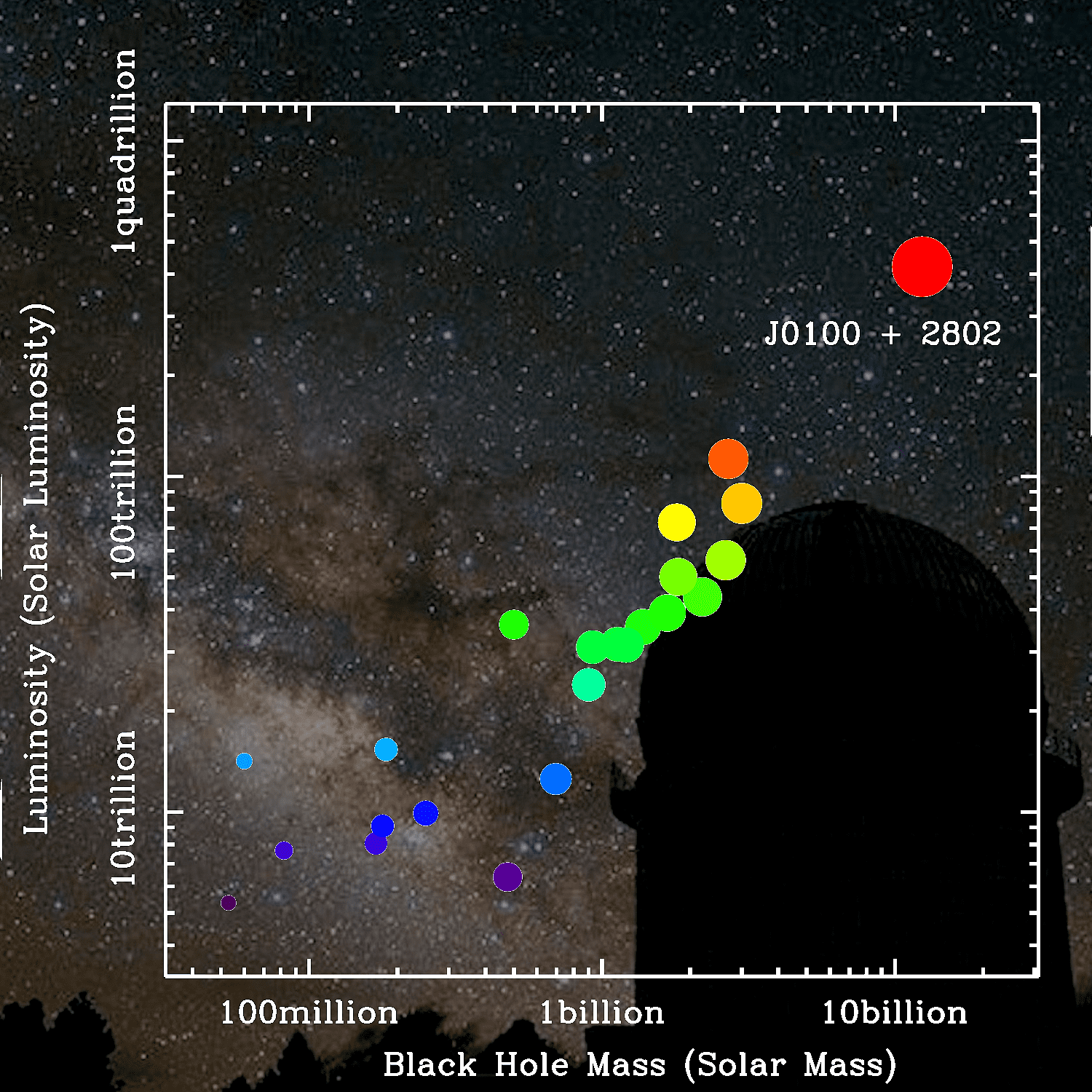 Wu und seine Koautoren hoffen nun, durch die weitere Untersuchung des Schwarzen Lochs auch mehr über die Entstehung von massereichen Galaxien im frühen Universum herausfinden zu können. Denn im Allgemeinen besteht eine enge Beziehung zwischen der Masse Schwarzer Löcher und der Gesamtmasse der Galaxie, in der sie sich befinden: Typischerweise ist die Masse des Schwarzen Lochs höher, wenn es sich in einer massereicheren Galaxie aufhält. Dabei liegt das Verhältnis der Massen des Schwarzen Lochs zu derjenigen der Galaxie zwischen 0,14 und 0,5 Prozent [6,7]. Wenn sich dieses typische Verhältnis auch im jungen Universum bestätigt, so brächten es die Sterne der Galaxie um SDSS J010013.02+280225.8 auf beeindruckende vier bis neun Billionen Sonnenmassen – ebenso viel wie die massereichsten Galaxien im heutigen Universum.