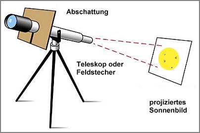Der Verlauf der Sonnenfinsternis lässt sich besonders bequem und sicher mit der bewährten und völlig ungefährlichen Projektionsmethode verfolgen. Dabei wird das Teleskop auf die Sonne gerichtet und das von ihm gesammelte Licht auf eine helle Fläche projiziert. Aber Achtung: Niemals dürfen Sie direkt in das aus dem Teleskop kommende Licht blicken! Achten Sie daher besonders darauf, dass nicht etwa Kinder versuchen, ins Teleskop zu schauen. In Sekundenbruchteilen kann es zu irreparablen Augenschäden kommen!
