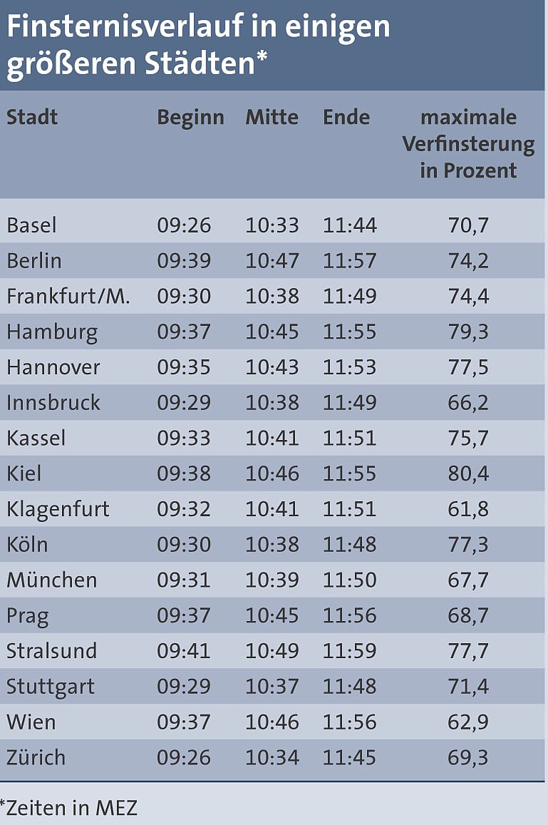 Zu Hause erwartet uns dafür zwar "nur" eine partielle Finsternis, aber wegen ihrer ungewöhnlichen Tiefe ist der Verlauf mit einer Dauer von zwei Stunden und 20 Minuten relativ lang und somit spannend. Auch lässt sich gegen 10:45 Uhr MEZ bei klarem Himmel eine deutliche Auswirkung auf die Stimmung der Umgebung erwarten: Es lassen sich eine fahle Beleuchtung und schärfere Schatten feststellen. Löcher in Baumblättern werfen dann lauter kleine Sicheln statt runder Sonnenbildchen auf den Boden, denn über Norddeutschland wird ein 80-prozentiger, im Alpenraum ein gut 65-prozentiger Verfinsterungsgrad erreicht. Damit ähnelt dieses Schattenspiel der eindrucksvollen partiellen Sonnenfinsternis vom 4. Januar 2011, aber die Sonne steht diesmal viel höher am Himmel, und auch das Klima ist jetzt, kurz vor Frühlingsanfang, günstiger. Die beigestellte Tabelle gibt für einige größere Städte die genauen Finsterniszeiten und Tiefen an.