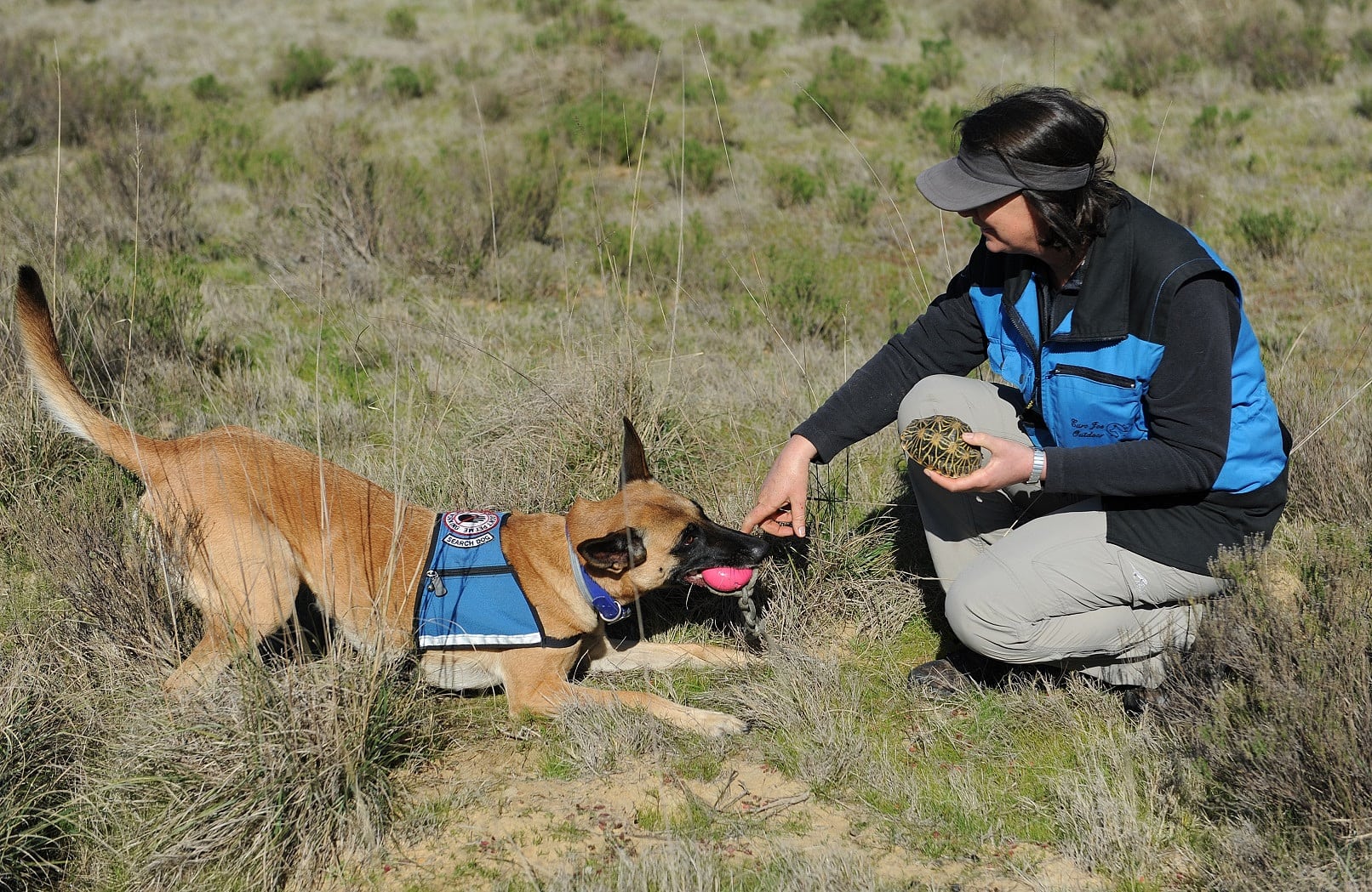 Es ist ein regnerischer Tag in der südafrikanischen Provinz Westkap. Die Schildkröten der Region verziehen sich bei solch einem Wetter lieber in ihre Panzer. Dank ihrer Tarnmuster ist die ohnehin nur 13 Zentimeter lange Geometrische Landschildkröte dann für das menschliche Auge praktisch gar nicht mehr zu erkennen. Brin interessiert das aber wenig. Die vierjährige Hündin, ein Belgischer Schäferhund, ein Malinois, verlässt sich ganz auf ihre Nase. Brin ist eine Spürhündin, und ihre Spezialität sind Landschildkröten.