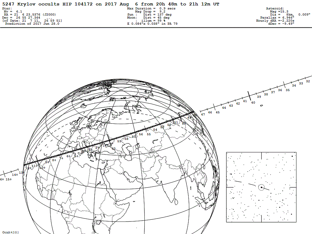 Eine weitere ganz besondere Sonnenfinsternis findet am 6. August statt: Der nur 15,3 mag helle Asteroid (5247) Krylov wird den Stern mit der Katalognummer HD 201051 für rund eine Sekunde bedecken. Der Stern befindet sich gleich neben der unteren Flügelspitze des Sternbilds Schwan. Er ist mit einer Helligkeit von 6,1 mag hell genug, um ihn auch im Fernglas oder einem kleinen Teleskop gut zu sehen. Allerdings muss man sich für die Beobachtung in die Ferne aufmachen, denn der Bedeckungspfad führt über Marokko und Algerien nach Italien, Albanien und Rumänien und weiter über die Ukraine und Russland. Solche Bedeckungen sind auch aus wissenschaftlicher Sicht sehr wertvoll, denn aus einer Vielzahl von Beobachtungen lässt sich ein Profil des bedeckenden Himmelskörpers mit einer wesentlich höheren räumlichen Auflösung erstellen, als es mit dem Weltraumteleskop Hubble oder einem irdischen Großteleskop möglich wäre.