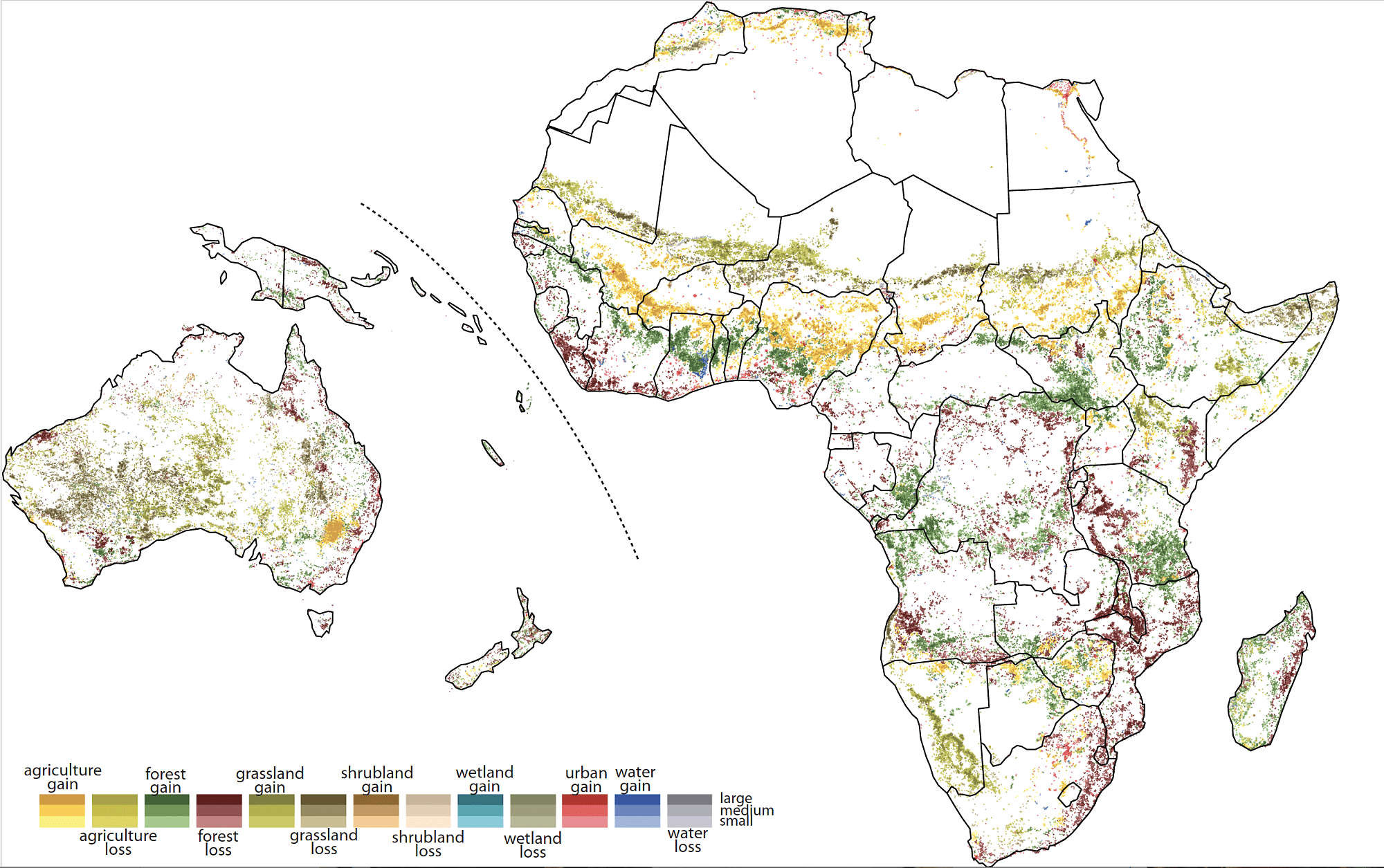 Die Originalbilder erlaubten eine Auflösung der Landoberfläche in 300 Quadratmeter große Felder und unterscheiden 22 Formen der Landnutzung. Die Geowissenschaftler fassten diese zu Feldern von neun mal neun Kilometern sowie sieben Nutzungsformen zusammen. Auf ihren Karten (siehe Bilder) stellen sie den Zuwachs oder Verlust einer Nutzungsform in verschiedenen Farben dar (siehe Legende) und illustrieren das Ausmaß der Veränderung durch helle beziehungsweise dunkle Töne. Demnach haben sich 22 Prozent der bewohnbaren Erdoberfläche zwischen 1992 und 2015 messbar gewandelt.