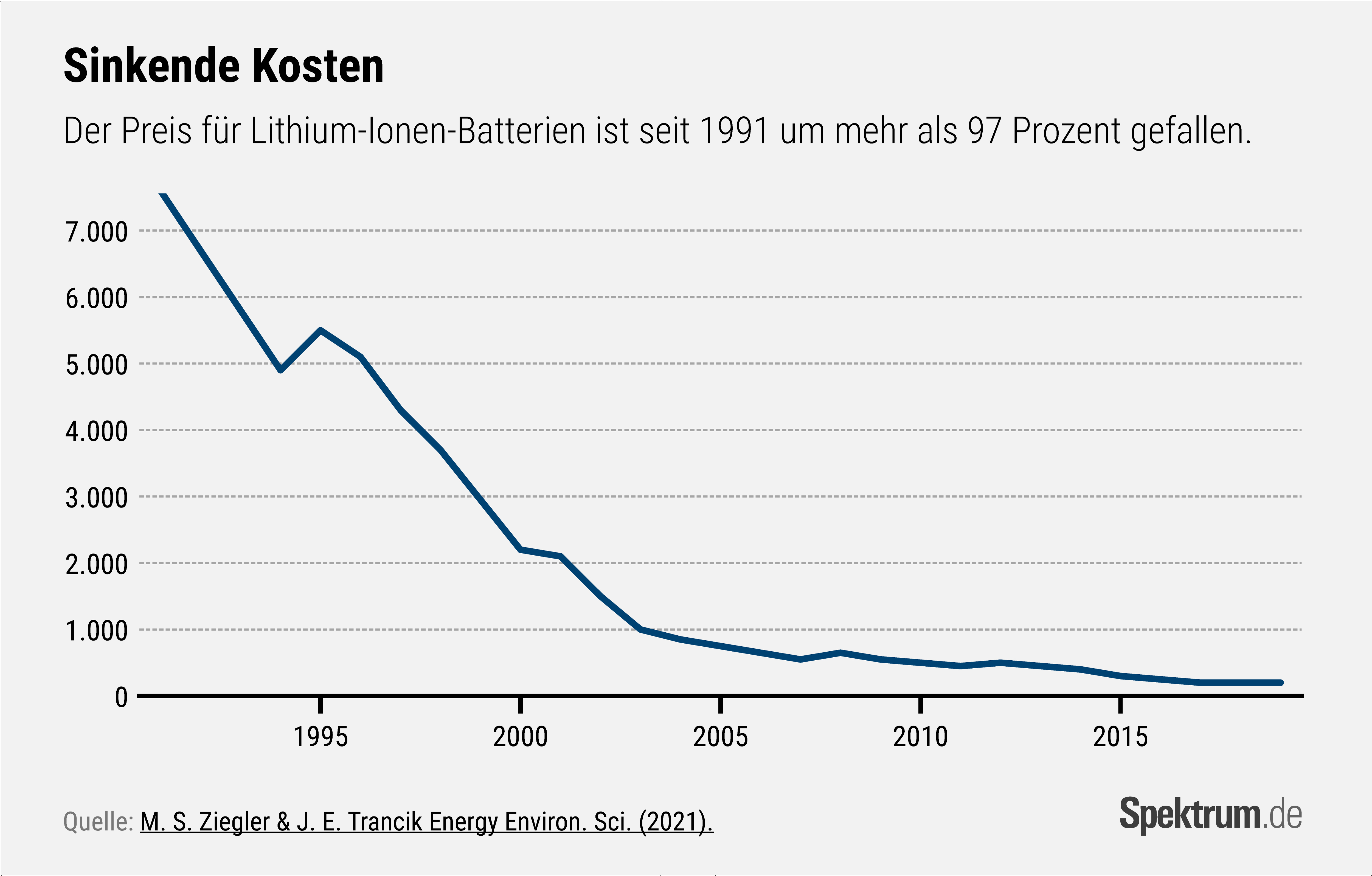 Der Preis für Lithium-Ionen-Batterien ist seit 1991 um mehr als 97 Prozent gefallen.