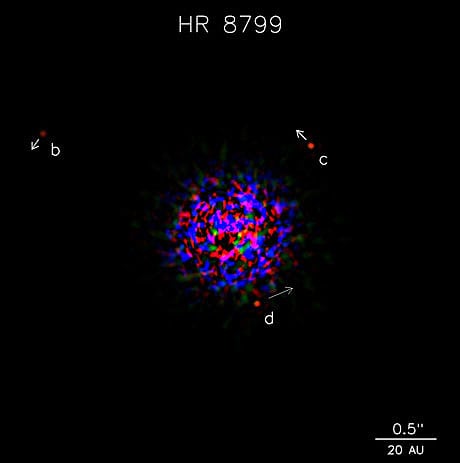 Das Planetensystem um den Stern HR 8799 war seit dem Jahr 2008 bekannt. Damals konnten Astronomen des Keck-Observatoriums auf Hawaii in Infrarotaufnahmen drei Planeten auf Umlaufbahnen um HR 8799 direkt abbilden. Zwei Jahre später gelang den Astronomen auch eine Aufnahme, die einen vierten Planeten in größerer Nähe zu dem etwa 130 Lichtjahre entfernten jungen Stern zeigt.