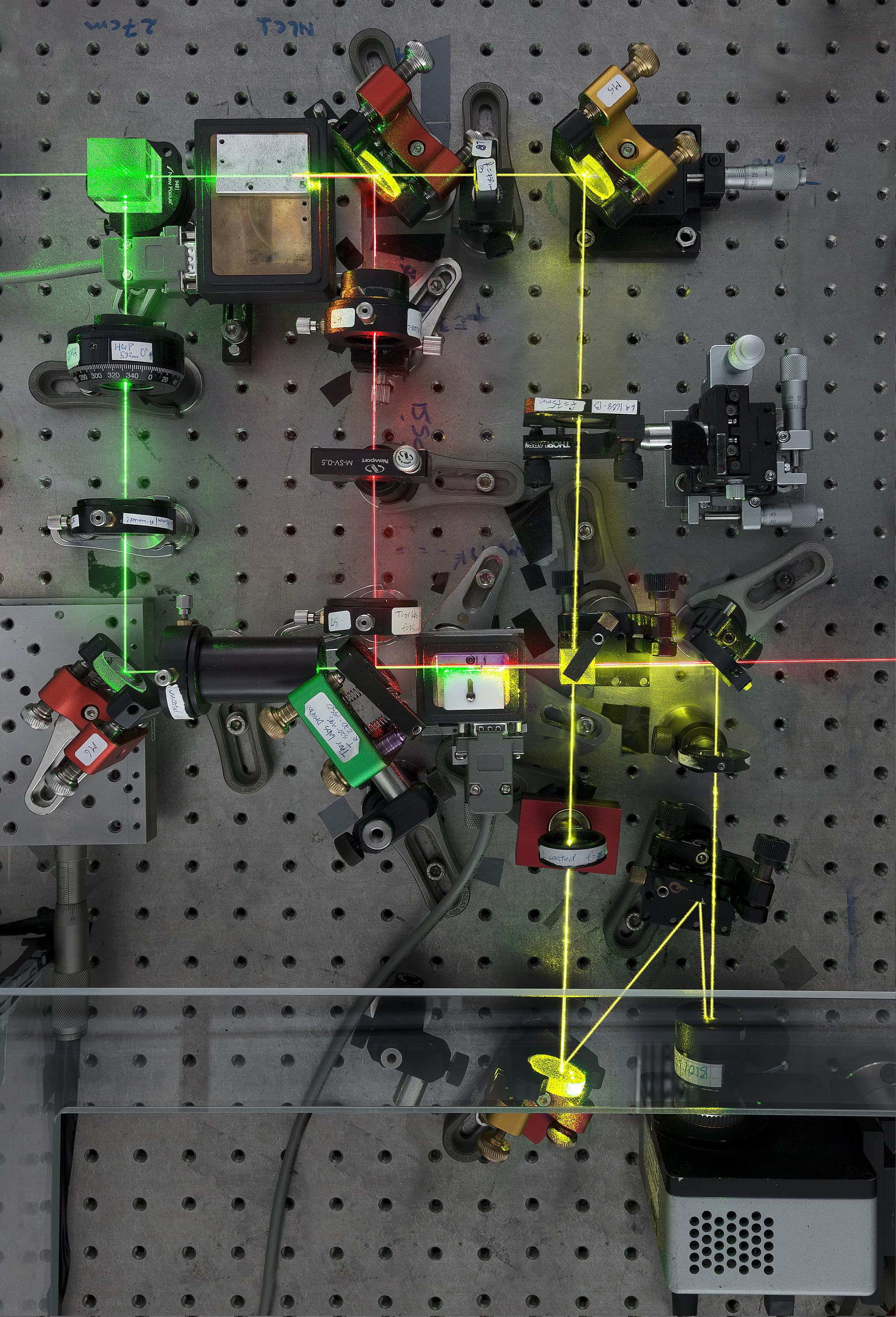 Die Wissenschaftler machten sich hierbei zu Nutze, dass sich bestimmte Quanteneigenschaften über ein ganzes System verteilen. Deshalb teilten sie einen einfallenden Laserstrahl mehrfach auf. Mit Hilfe spezieller Strahlteiler gewannen sie zunächst aus grünem Laserlicht von 532 Nanometern Wellenlänge zwei grüne Teilstrahlen. Diese Strahlen waren miteinander kohärent und deshalb in der Lage, Interferenz, also Überlagerungsmuster, zu erzeugen: Genauso wie Wasserwellen können auch Lichtwellen sich gegenseitig verstärken oder auslöschen. Dies ist bei Licht einfach dadurch möglich, dass man die Strahlen sehr präzise wieder vereint. Nach den Gesetzen der Quantenphysik treten Interferenzeffekte aber nur auf, wenn man den wieder zusammengeführten Strahlen nicht ansehen kann, welchen Weg sie genommen haben. Hätte man einen der beiden Strahlen etwa dazu benutzt, ein Objekt zu durchleuchten, wäre keine Interferenz mehr möglich gewesen.