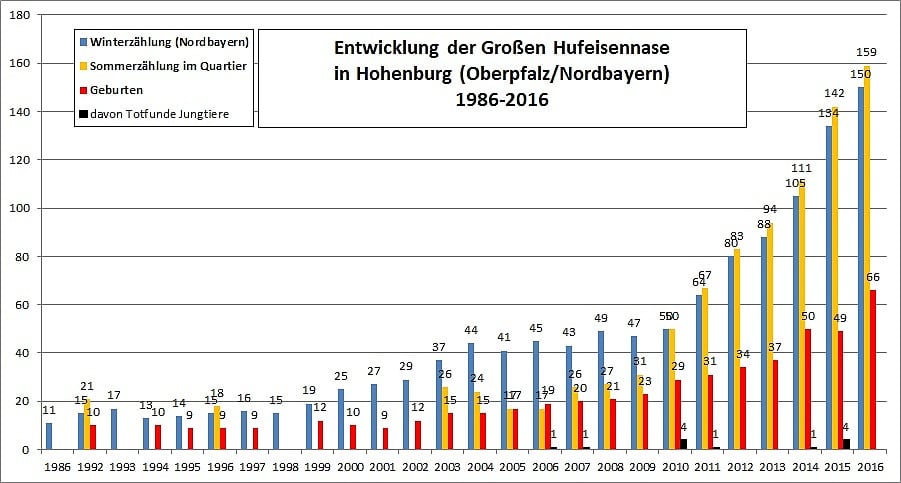 Längst schlägt sich die gute Versorgungslage auch in den Zahlen nieder. Hingen 1996 gerade einmal 18 Weibchen im Dachboden des Fledermaushauses in Hohenburg, die neun Junge aufzogen, waren es 2009 bereits 31 Weibchen mit 23 Jungen. Seither erlebt die Kolonie einen Boom, der auch die Naturschützer des LBV überrascht hat: 2012 brachten es 83 Weibchen schon auf 34 Junge, und 2016 wird mit 159 Weibchen und 66 Jungen ein sagenhafter Rekord aufgestellt. Und auch in den Winterquartieren zählen die Naturschützer statt der elf Hufeisennasen im Jahr 1986 drei Jahrzehnte später 150 Tiere. »Dabei finden wir vermutlich längst nicht alle Hufeisennasen, sondern wohl nur zwei Drittel der Population«, vermutet Leitl. Insgesamt dürften 2016 also deutlich mehr als 200 Tiere in der letzten deutschen Kolonie der Großen Hufeisennase leben.