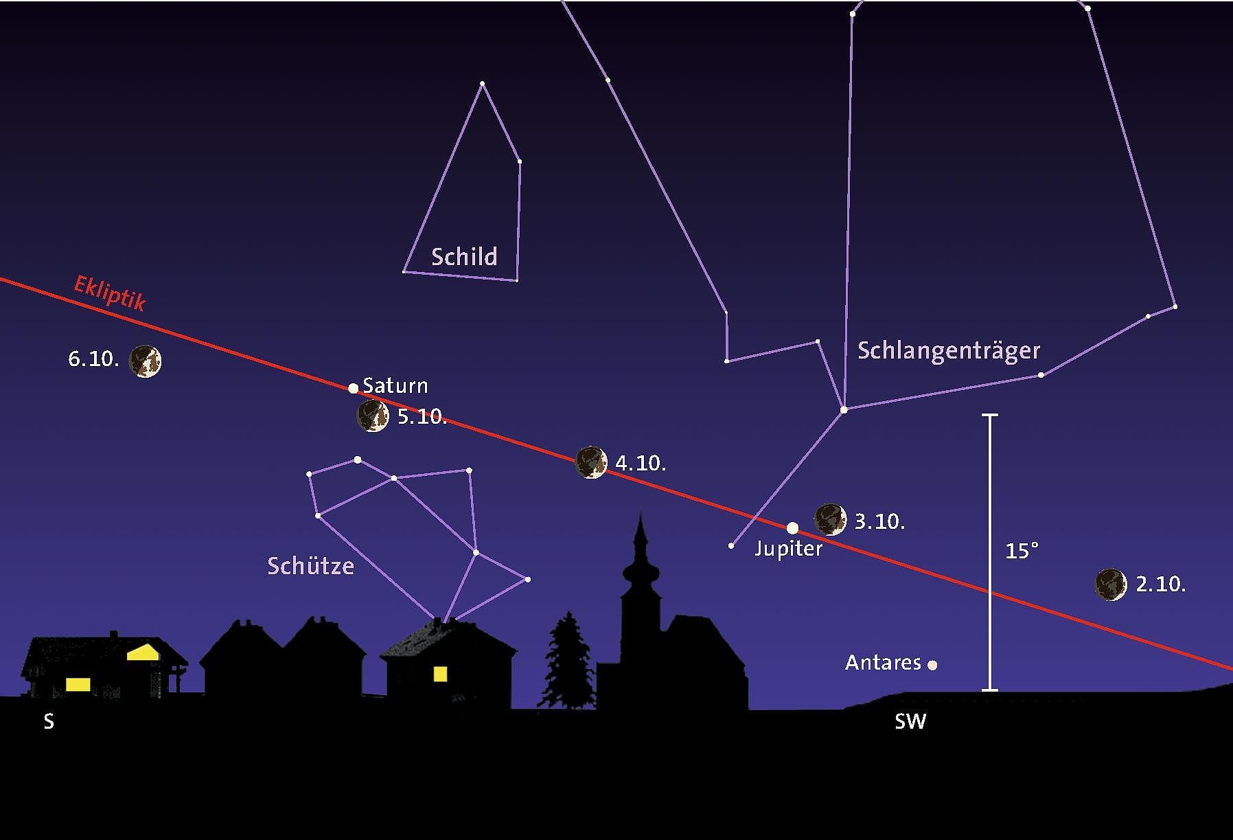 Saturn steht im Sternbild Schütze und damit am Abendhimmel. Der Ringplanet ist nach Ende der Dämmerung etwa 15 Grad hoch im Südsüdwesten zu finden. Er erscheint 0,5 mag hell. Am 1. Oktober geht Saturn um 23:46 Uhr MESZ unter, Ende des Monats um 20:54 Uhr MEZ (21:54 Uhr MESZ). Für Teleskopbeobachter gilt der gleiche Hinweis wie bei Jupiter: Es braucht ruhige Luft, um den Planeten, seine Ringe und sein Mondsystem mit höherer Vergrößerung beobachten zu können. Der Planet erscheint (ohne Ringe) gut 16 Bogensekunden groß; sein Ringsystem ist zu 25 Grad geöffnet. Am Abend des 5. Oktober steht der zunehmende Mond 1,2 Grad südwestlich von Saturn.